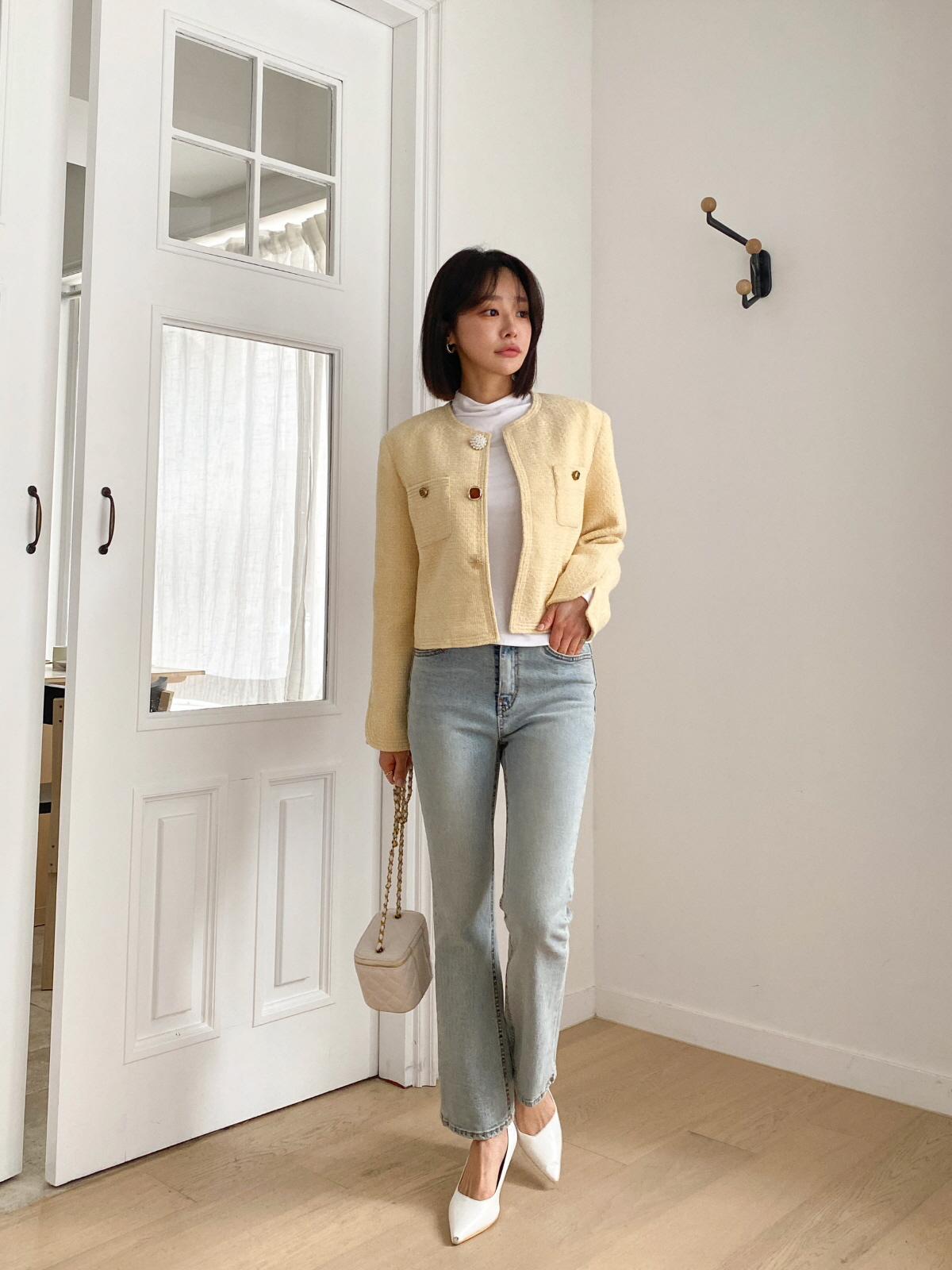 버튼 디테일이 들어가있어 더욱 고급스러워 보이며 오피스룩이나 하객룩으로 페미닌한 룩을 연출하기에 좋은 트위드 자켓