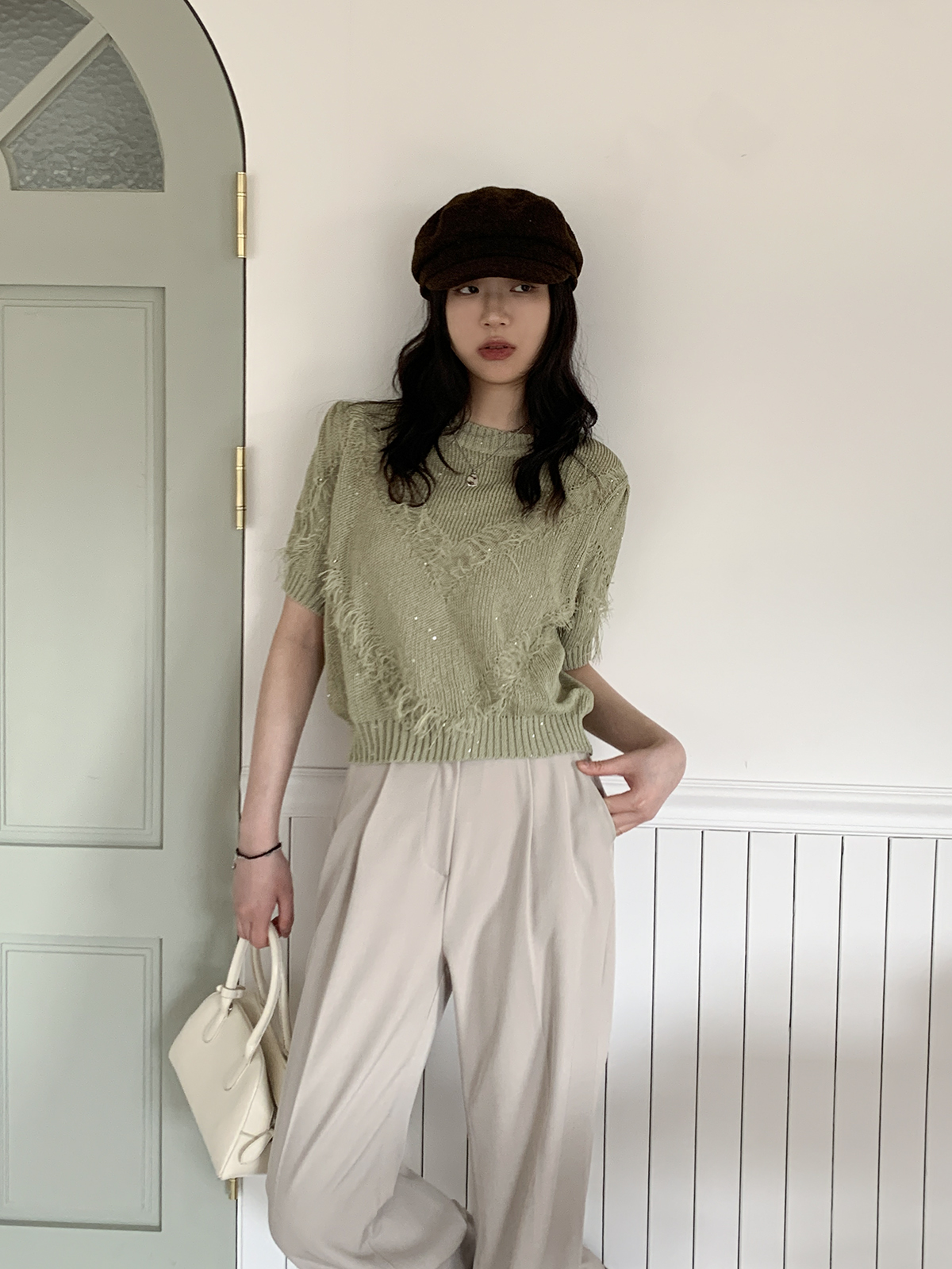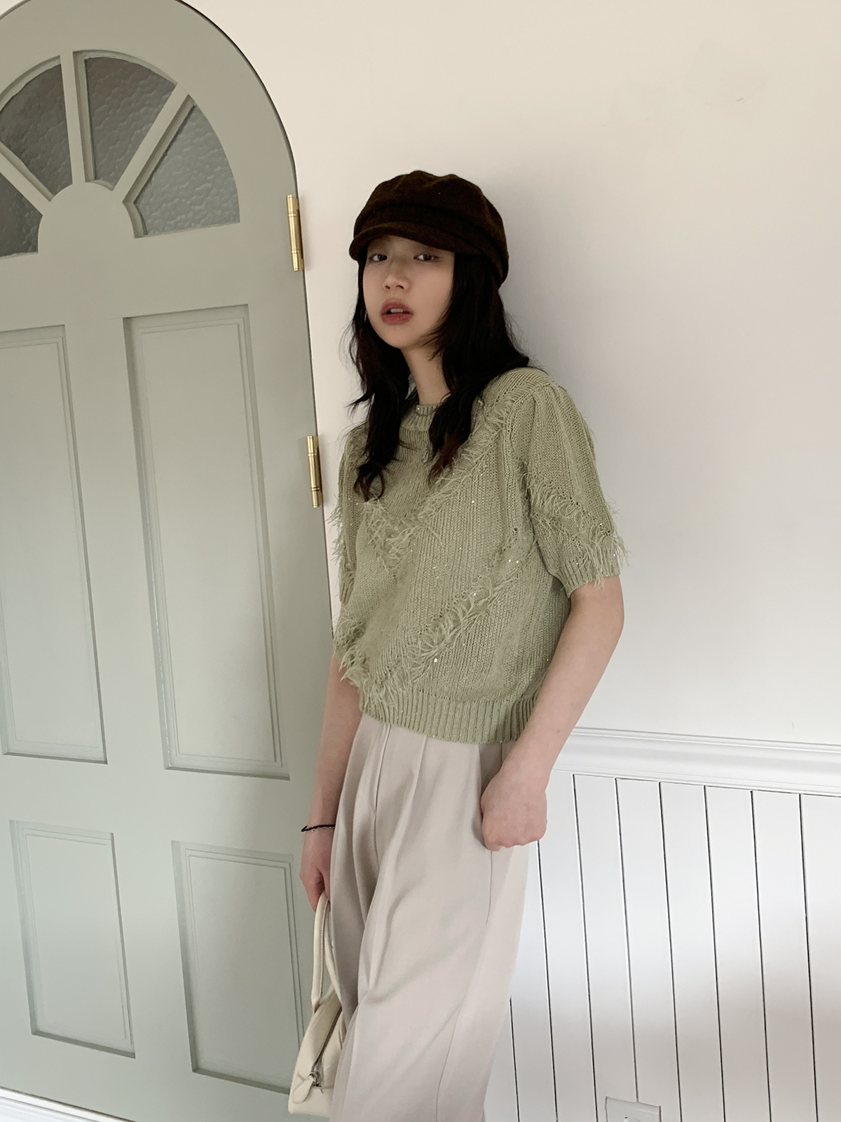 #니트#라운드넥니트#여성니트#데일리니트#니트코디#데일리코디#페미닌#러블리#캐쥬얼#데일리#프린지#반팔니트