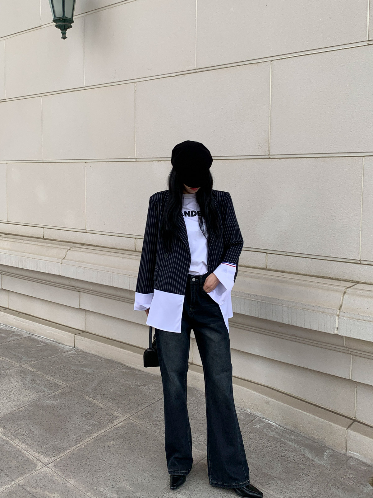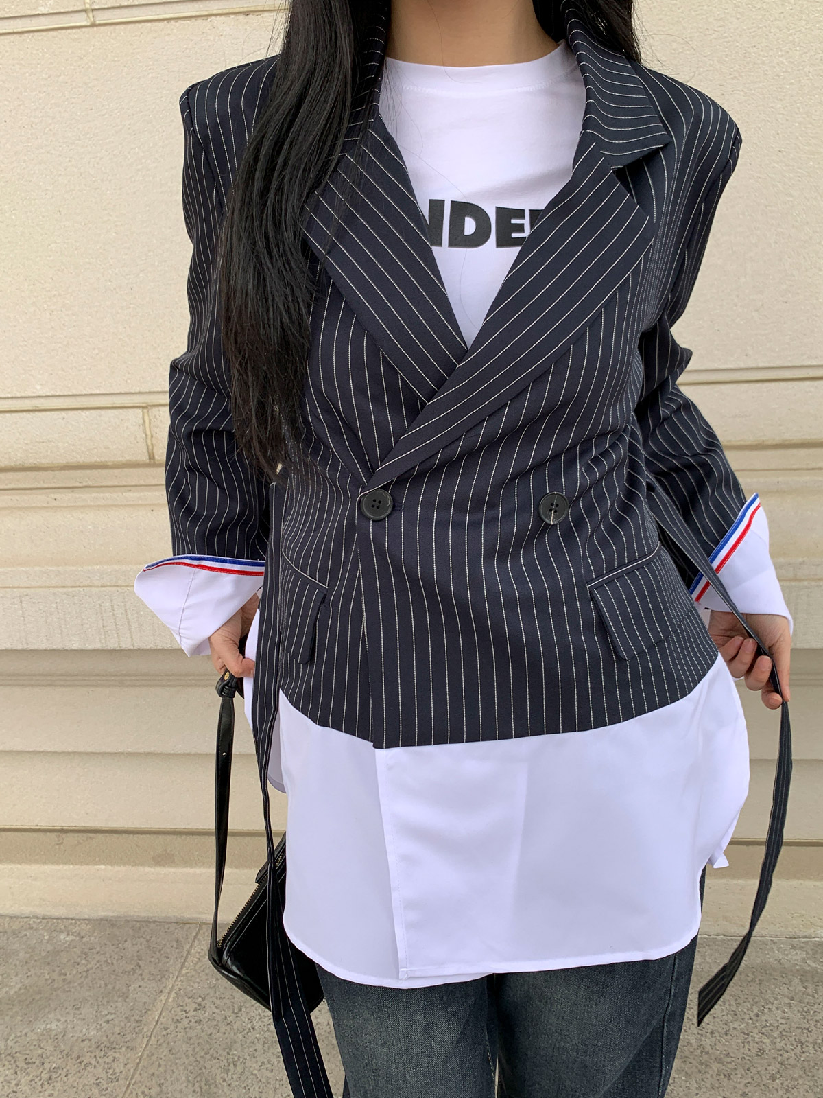 세로 스트라이프 패턴으로 세미오피스룩 느낌을 내주며, 소매와 밑단에 배색 셔츠를 레이어드한 듯한 디자인으로 유니크함을 연출해주고, 세트상품인 타이넥을 같이 매어 페미닌한 넥라인을 연출해주며, 옆사이드에 둥근 트임과 뒷 트임으로 포인트 주기 좋은 블레이저 자켓