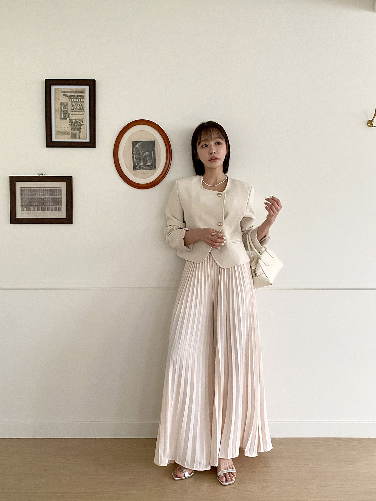 플리츠 주름 디자인으로 체형 커버가 되며 허리가 밴딩으로 처리 되어있어 편안한 착용감을 느낄 수 있는 바지