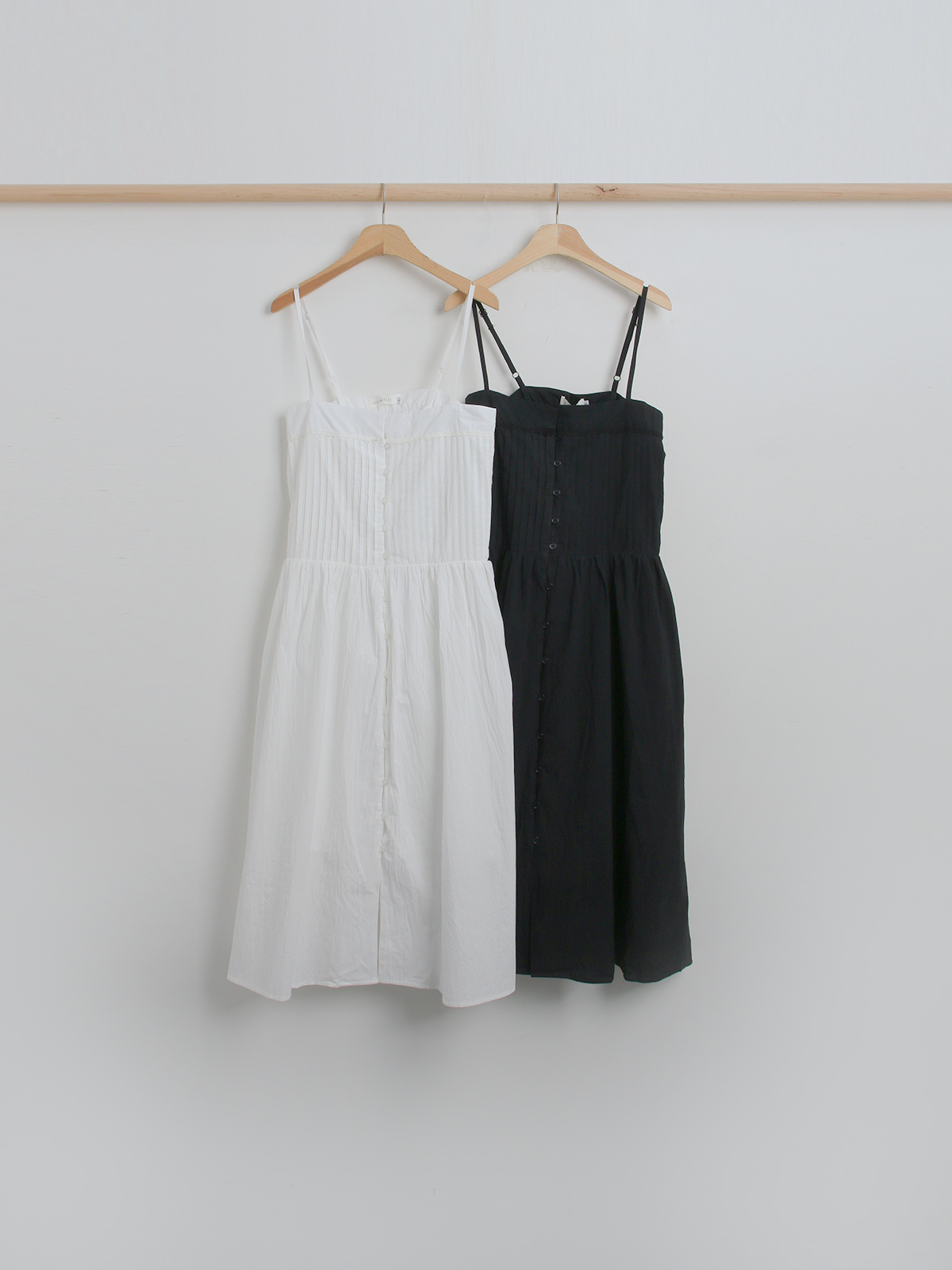 깔끔한 핀턱주름 디자인이 페미닌하게 연출해주며 작은 단추들이 귀여운 포인트를 주는 끈나시 롱원피스