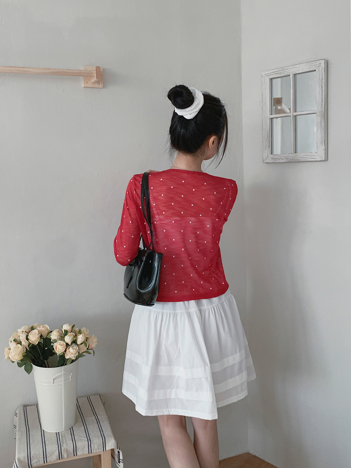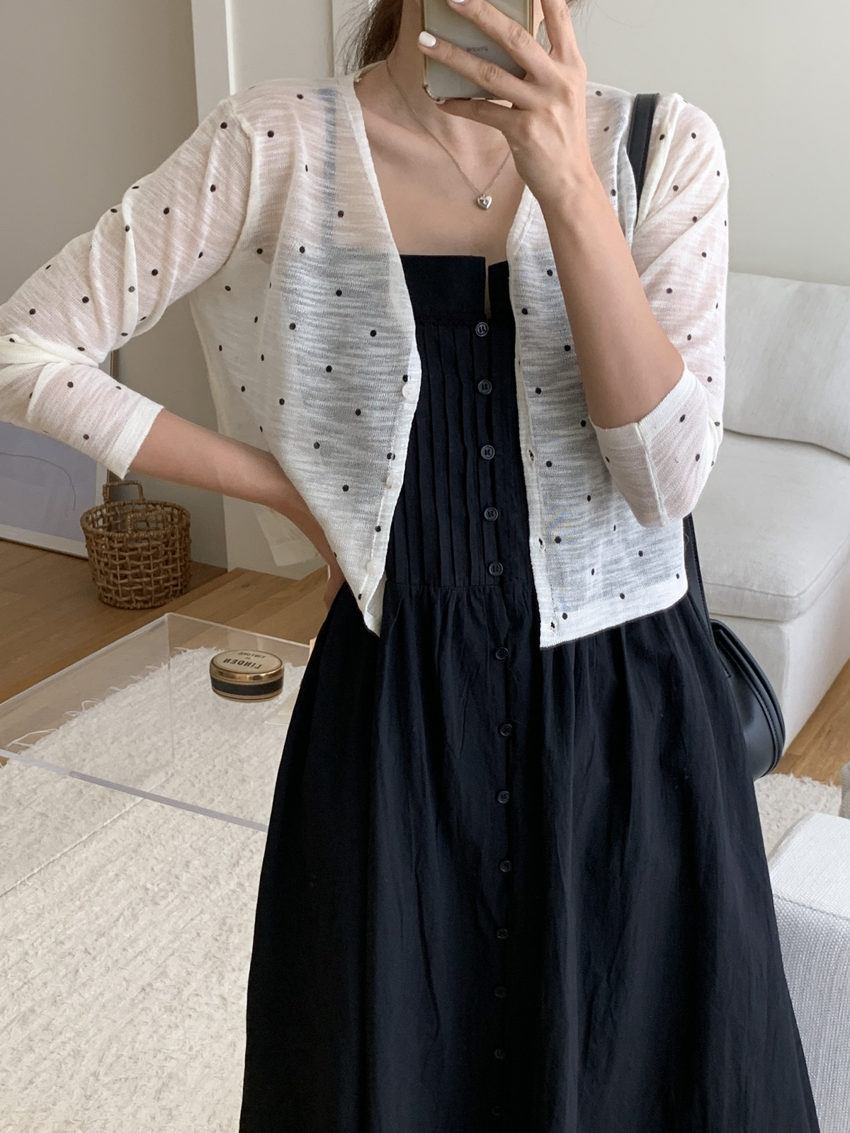 도트 패턴이 러블리한 무드를 더해주는 베이직한핏의 브이넥 가디건이며 두껍거나 덥지않은 린넨소재로 여름에 툭 걸치기에도 좋은 가디건