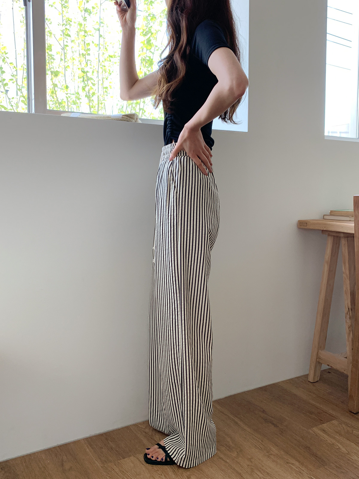 소프트느낌의 컬러감과 스트라이프 패턴이 더해져 전체적으로 차분하고 부드러운 느낌의 팬츠에요!