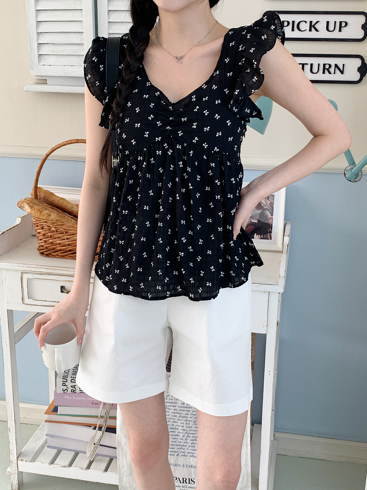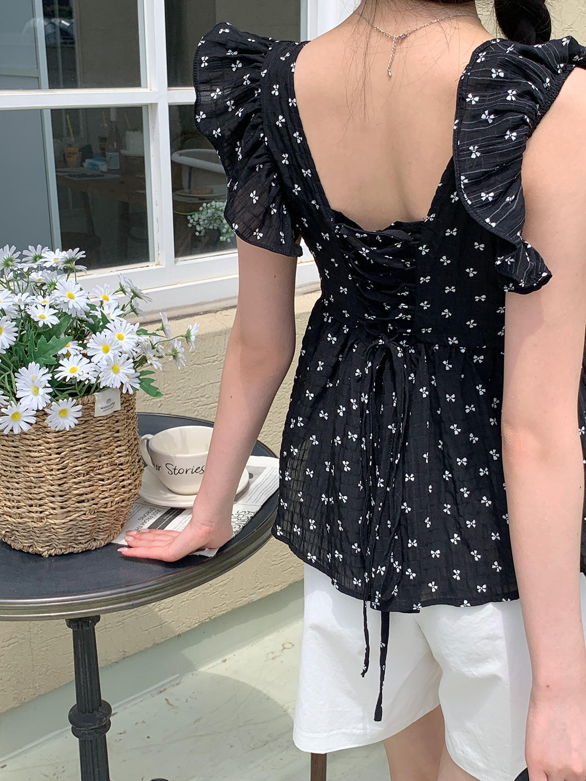 리본 패턴이 전체적으로 들어가있어 러블리하며 어깨 쪽의 프릴 디테일과 뒷면의 아일렛 디테일이 포인트가 되는 나시 블라우스
