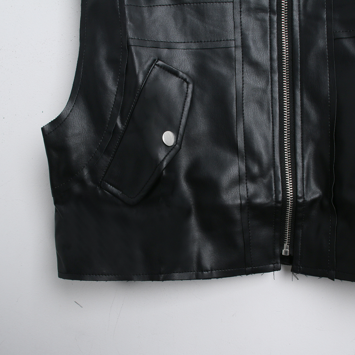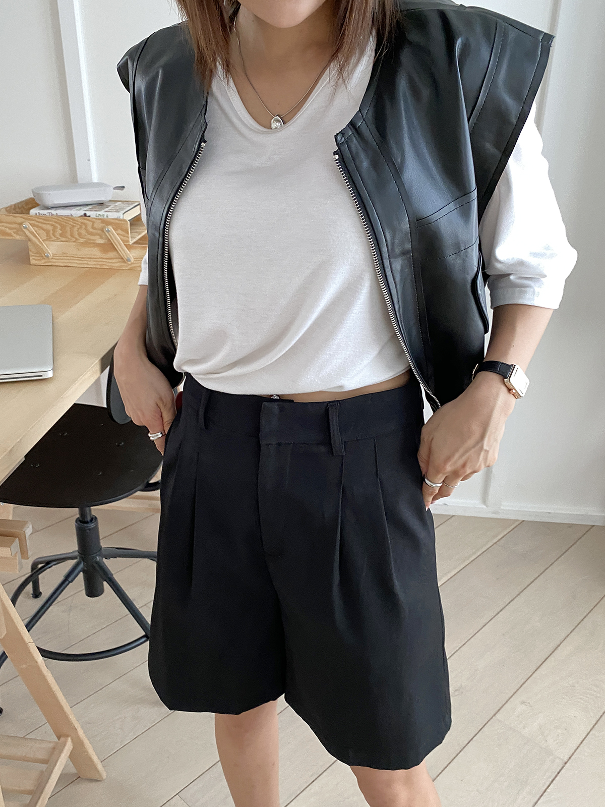 크롭한 기장으로 다리라인이 길어 보이게 해주며, 흔하지 않은 디자인의 가죽 조끼 자켓으로 룩에 포인트를 주기 좋아 추천해요~!