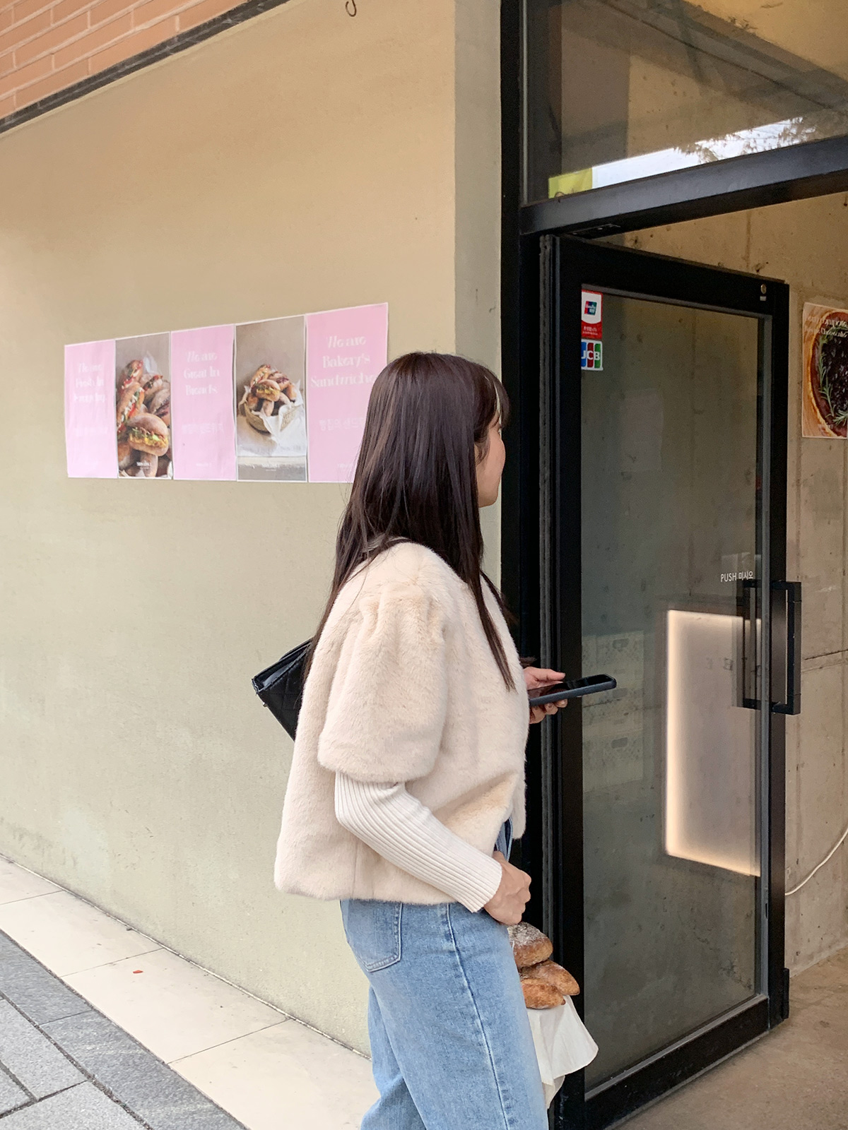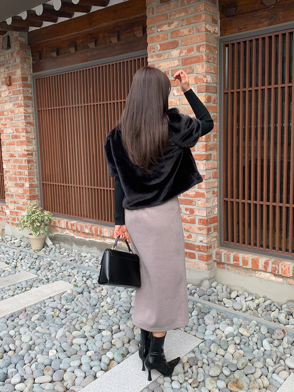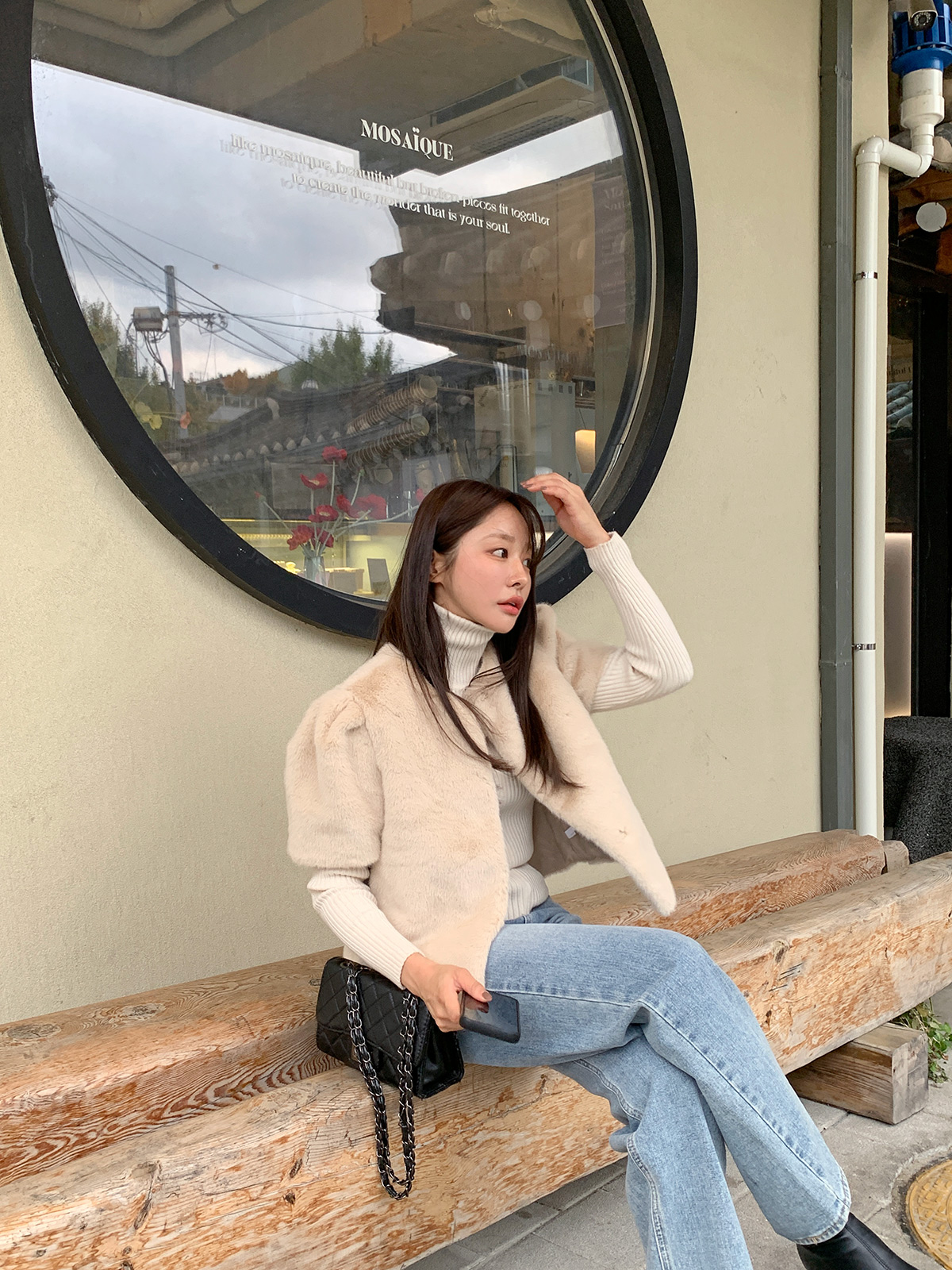 레빗 퍼에 똑딱이 단추가 있어서 러블리하면서도 여성스러운 무드로 입을 수 있으며