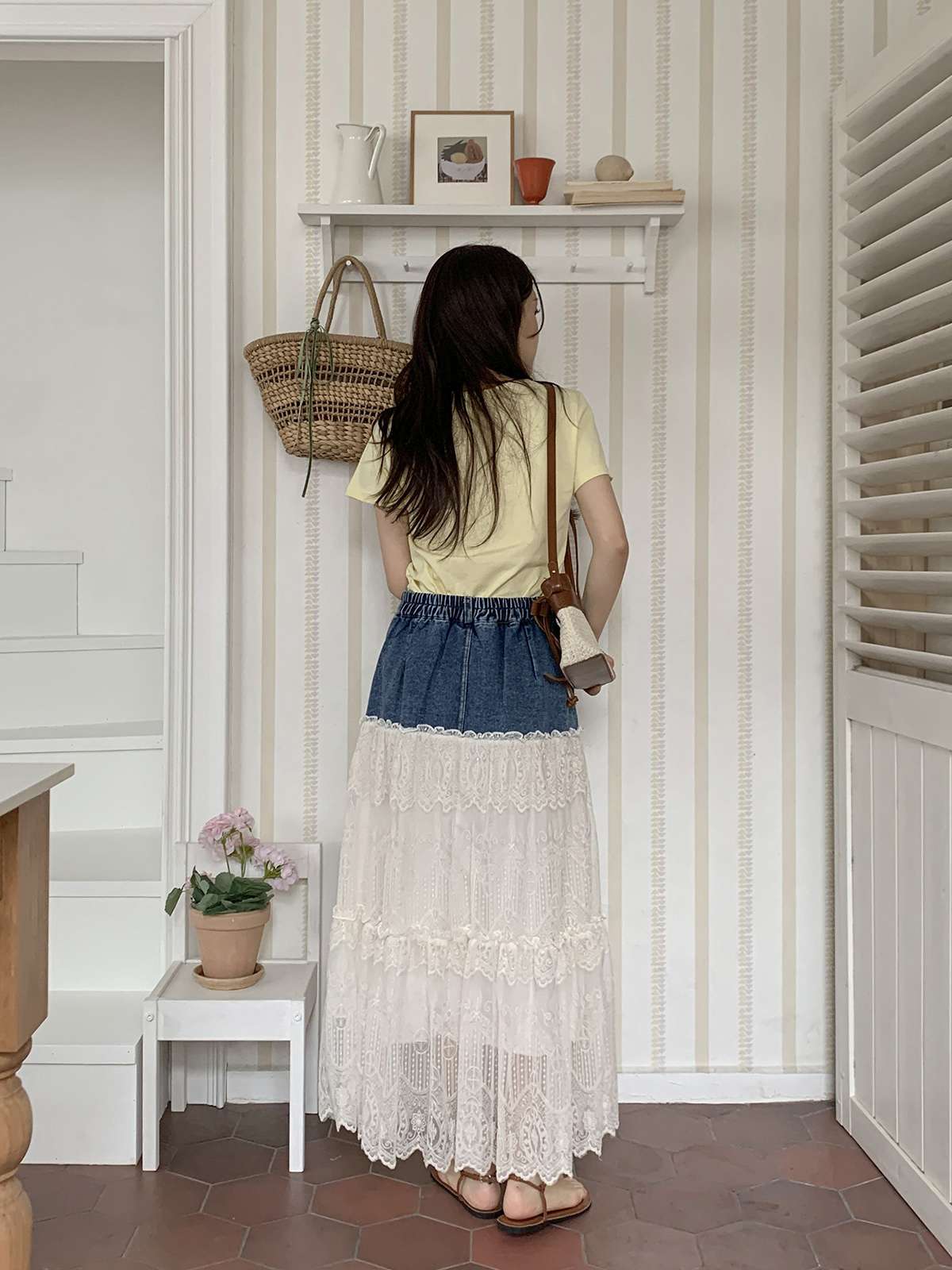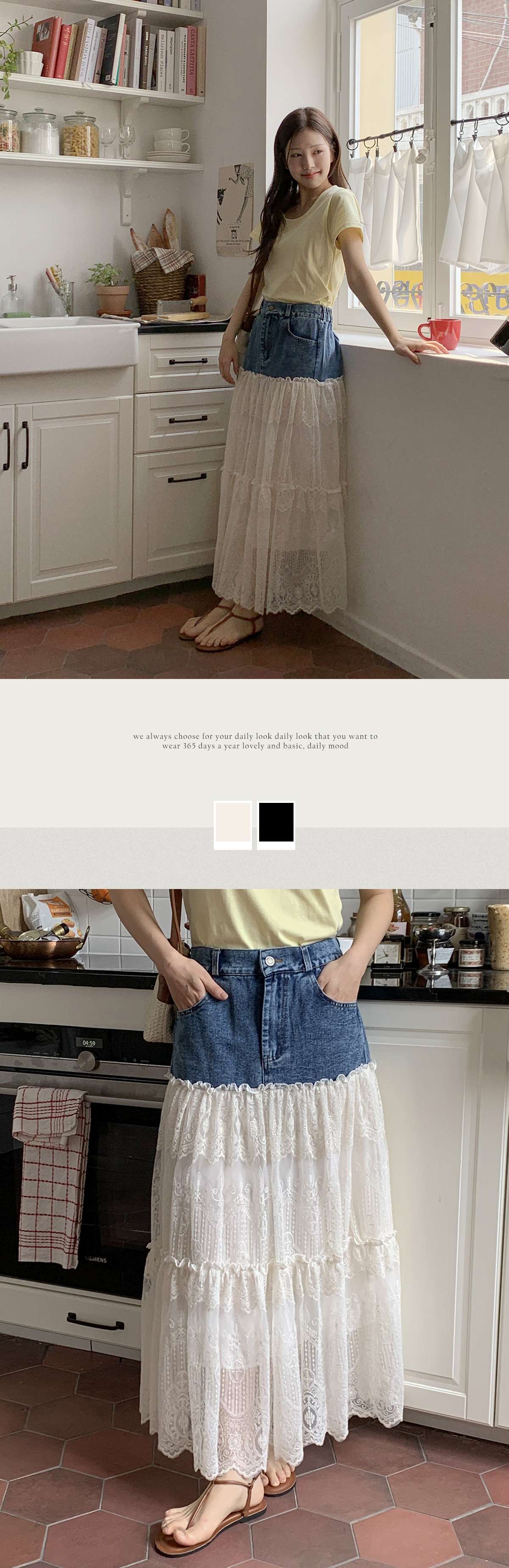 데님 레이어가 된 레이스 캉캉 롱스커트