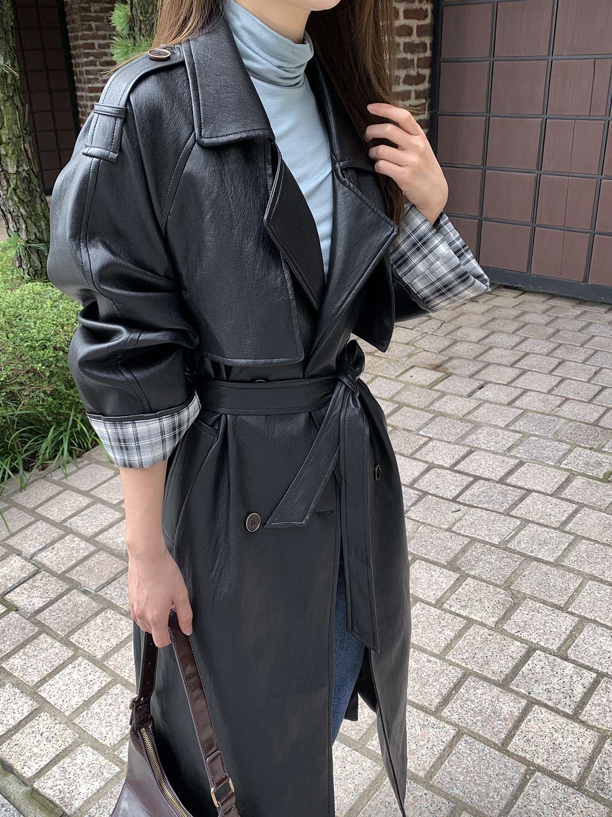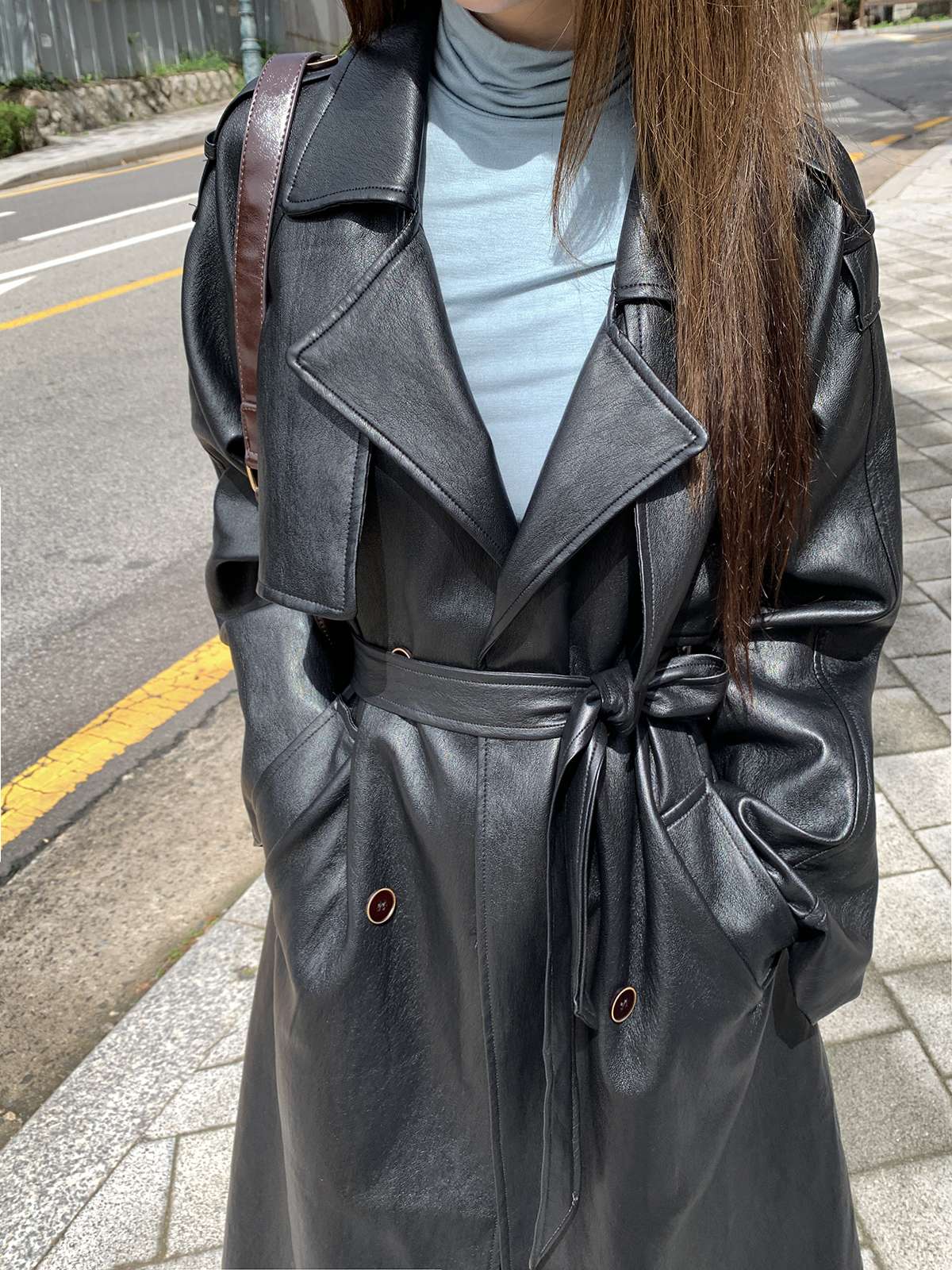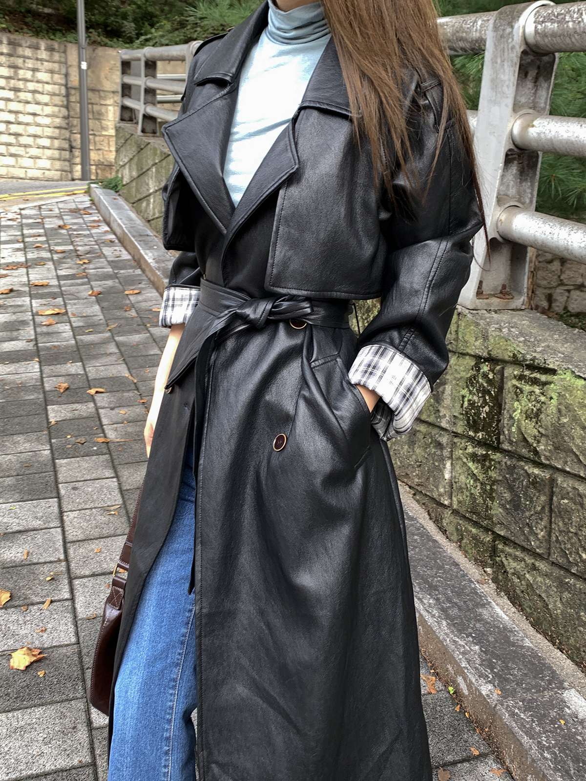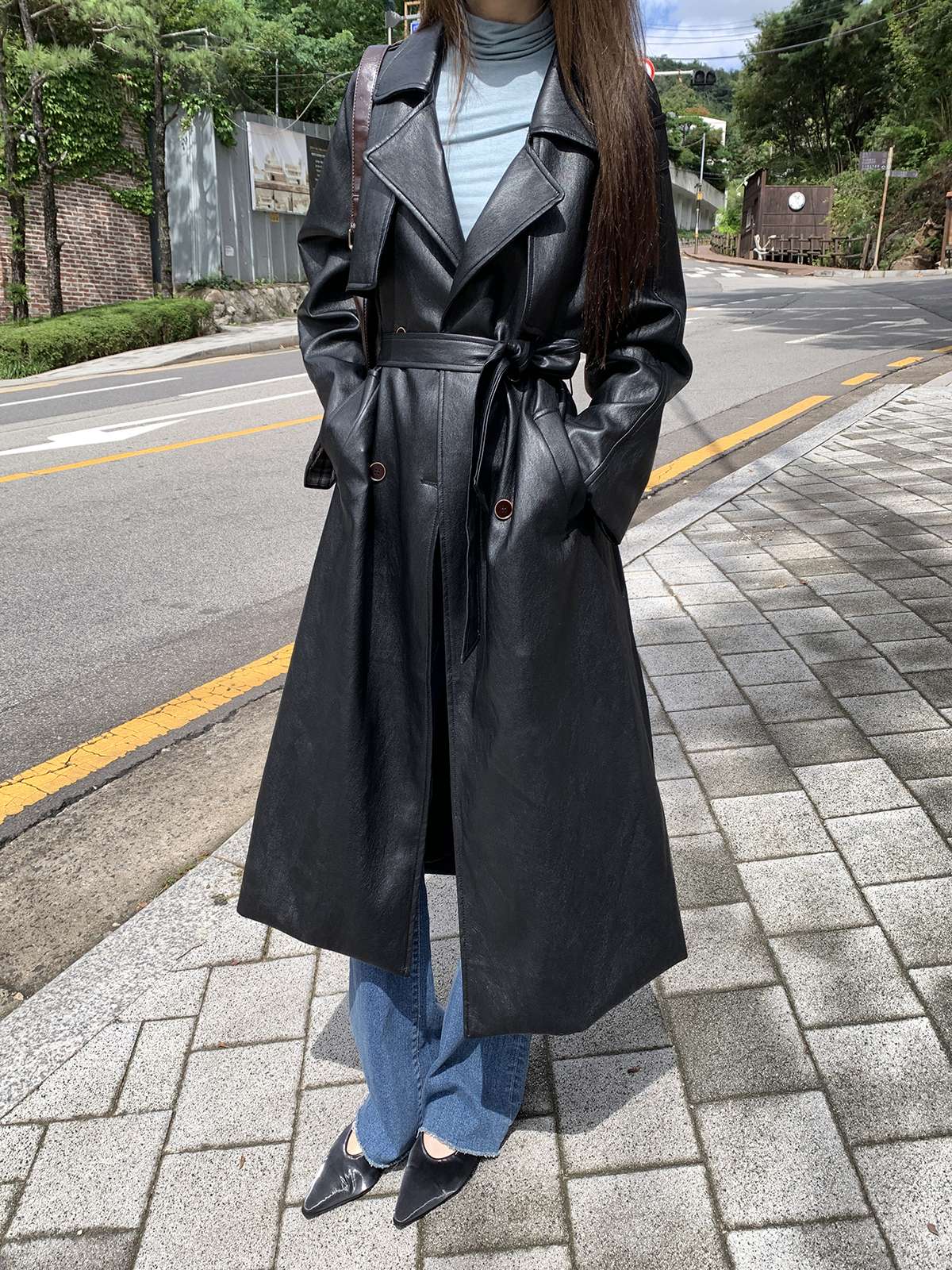 고급스러운 가죽 소재가 돋보이는 트렌치코트예요!