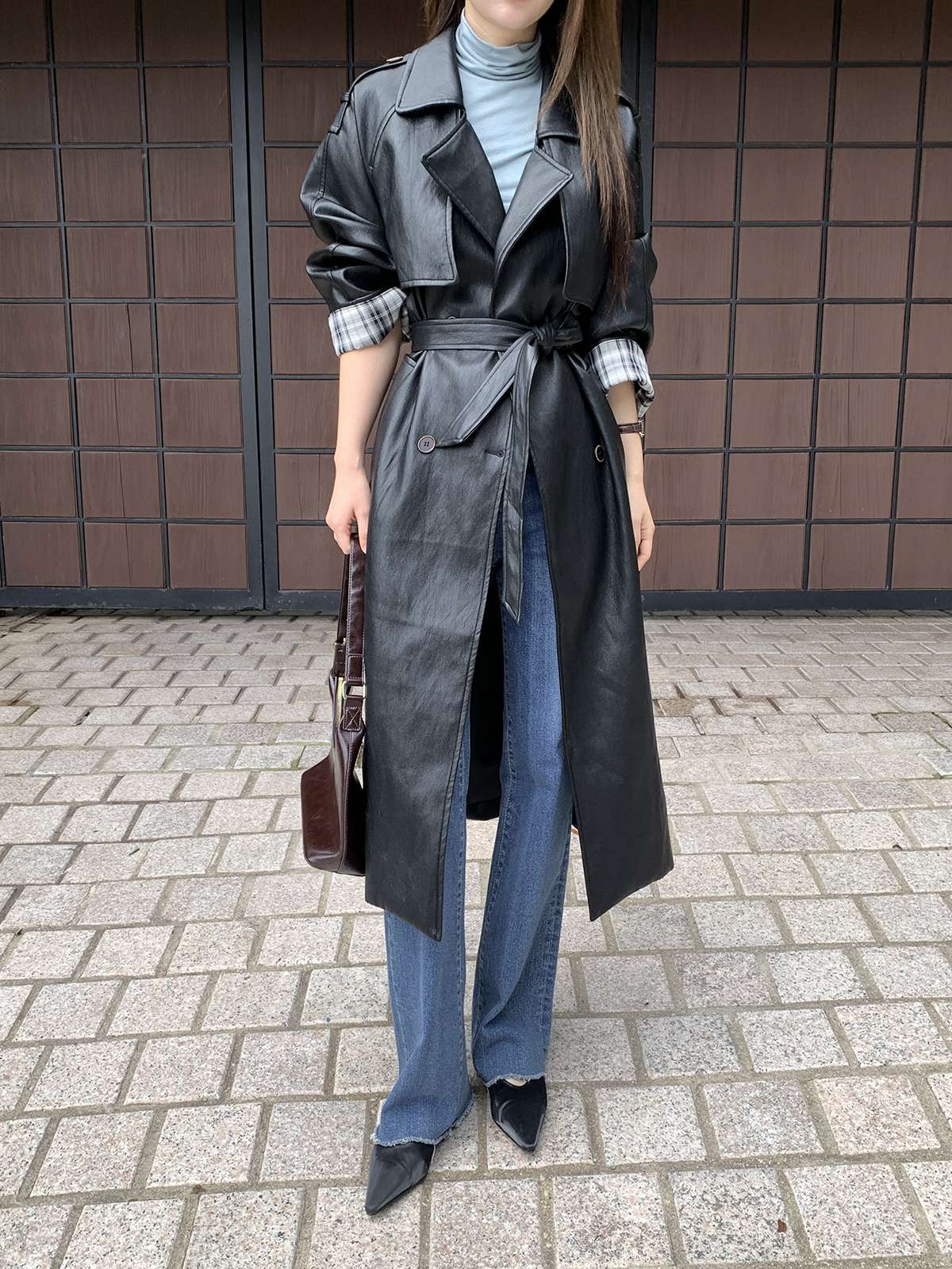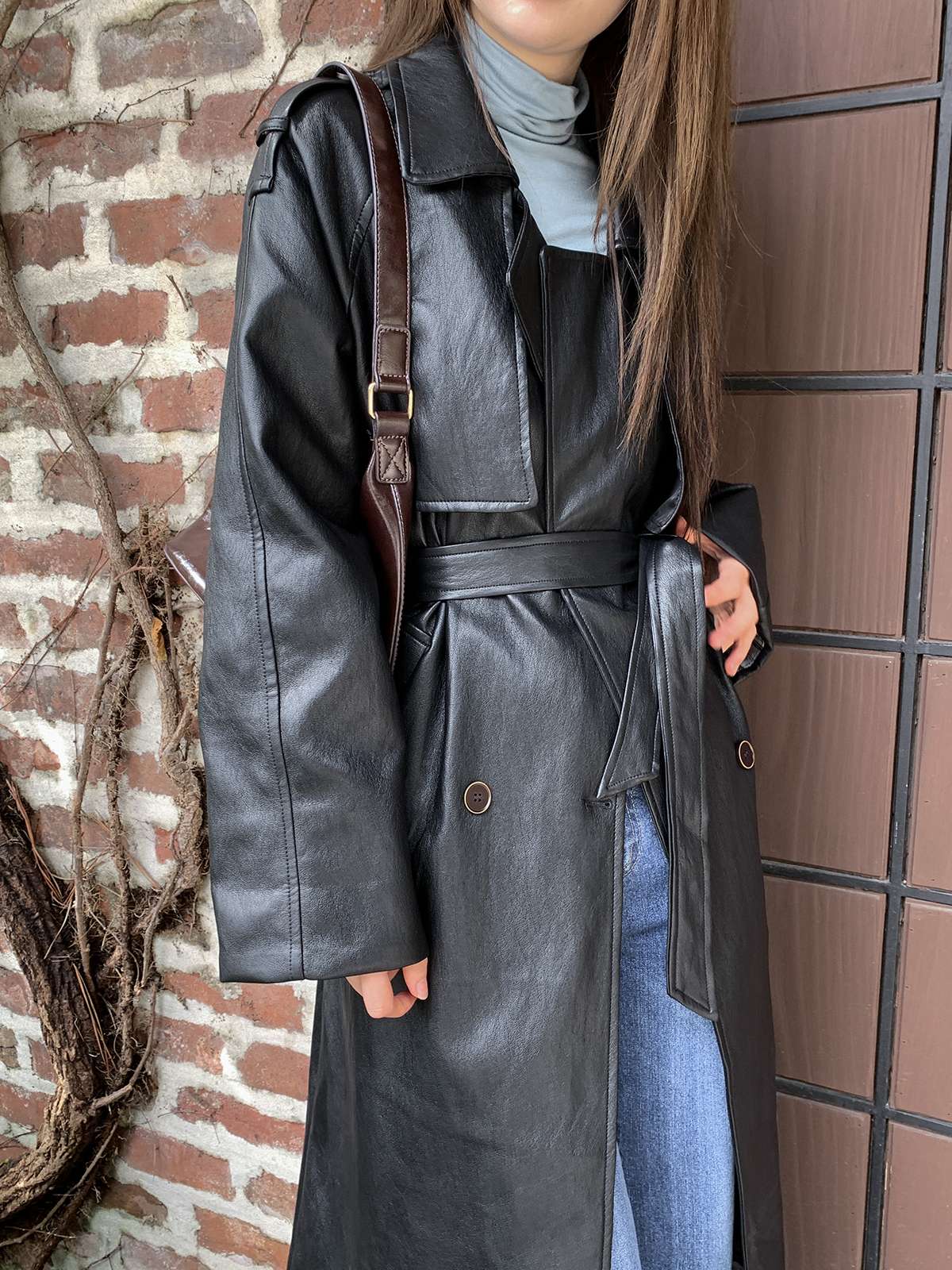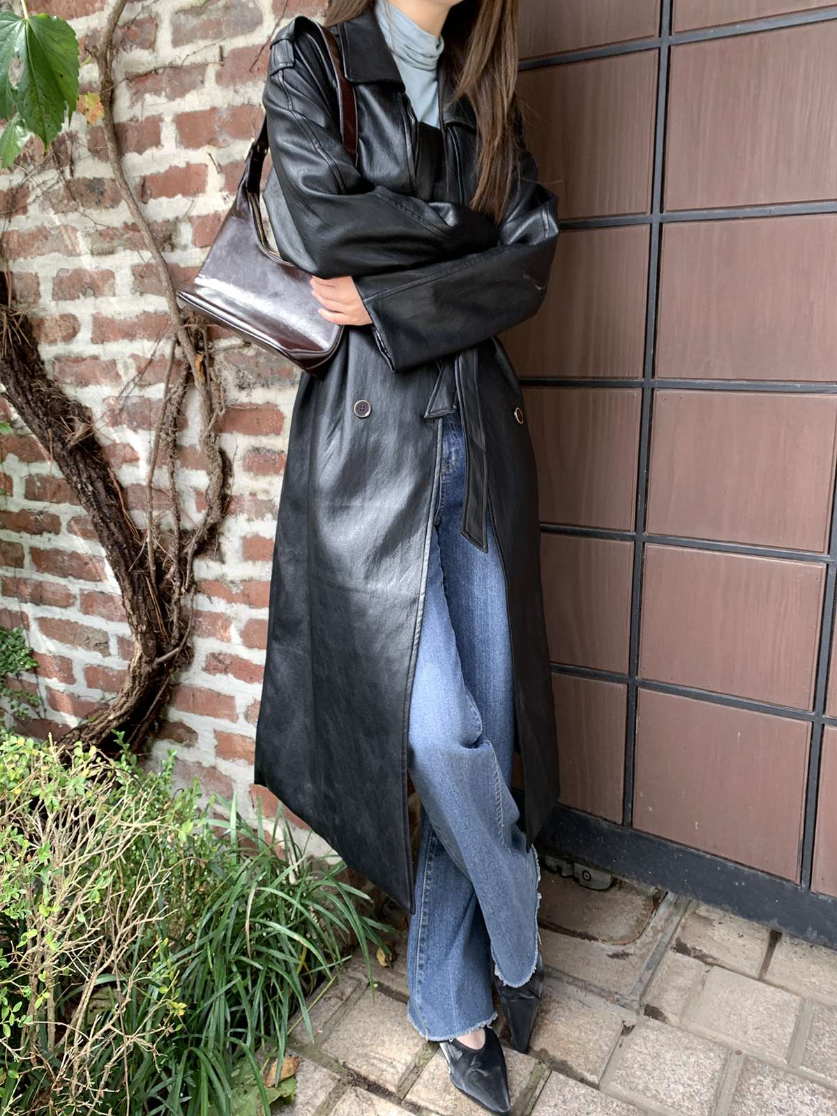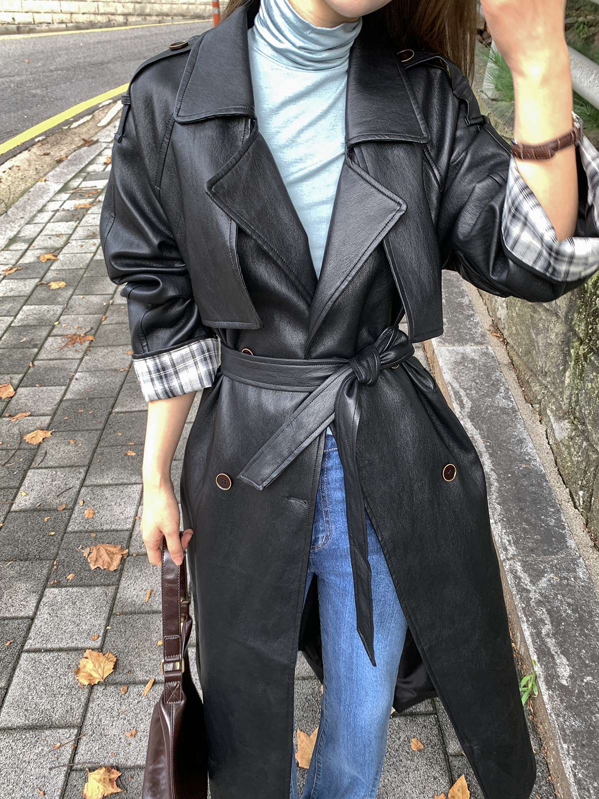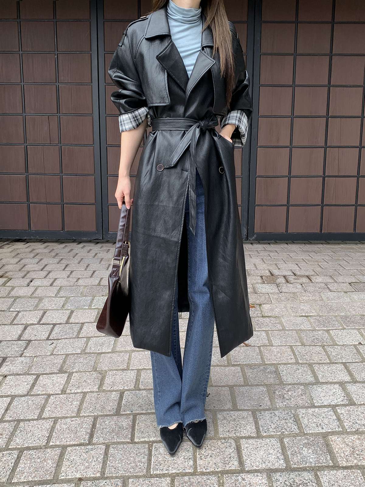 넉넉한 핏감에 가죽 소재가 돋보이는 트렌치 코트