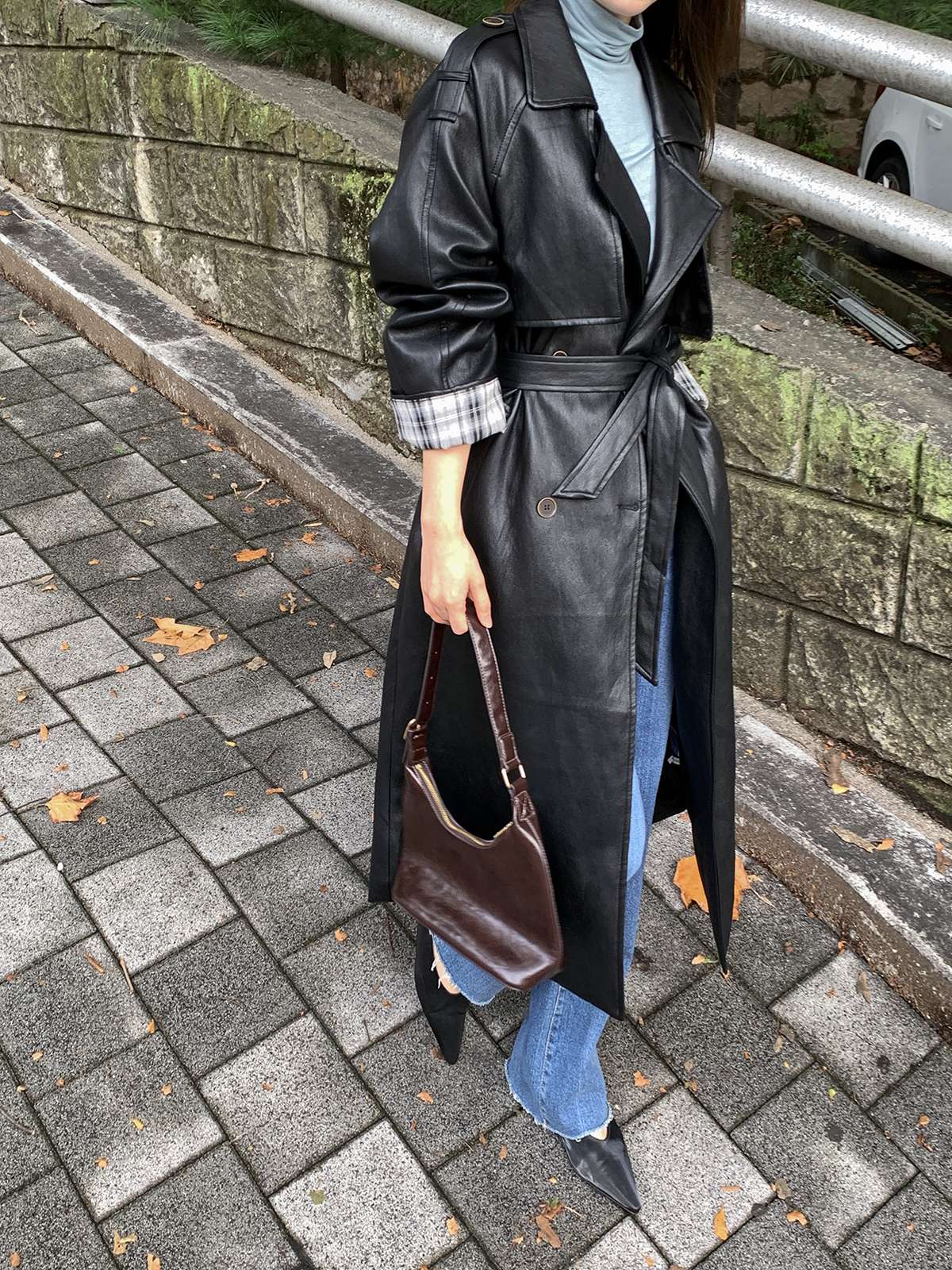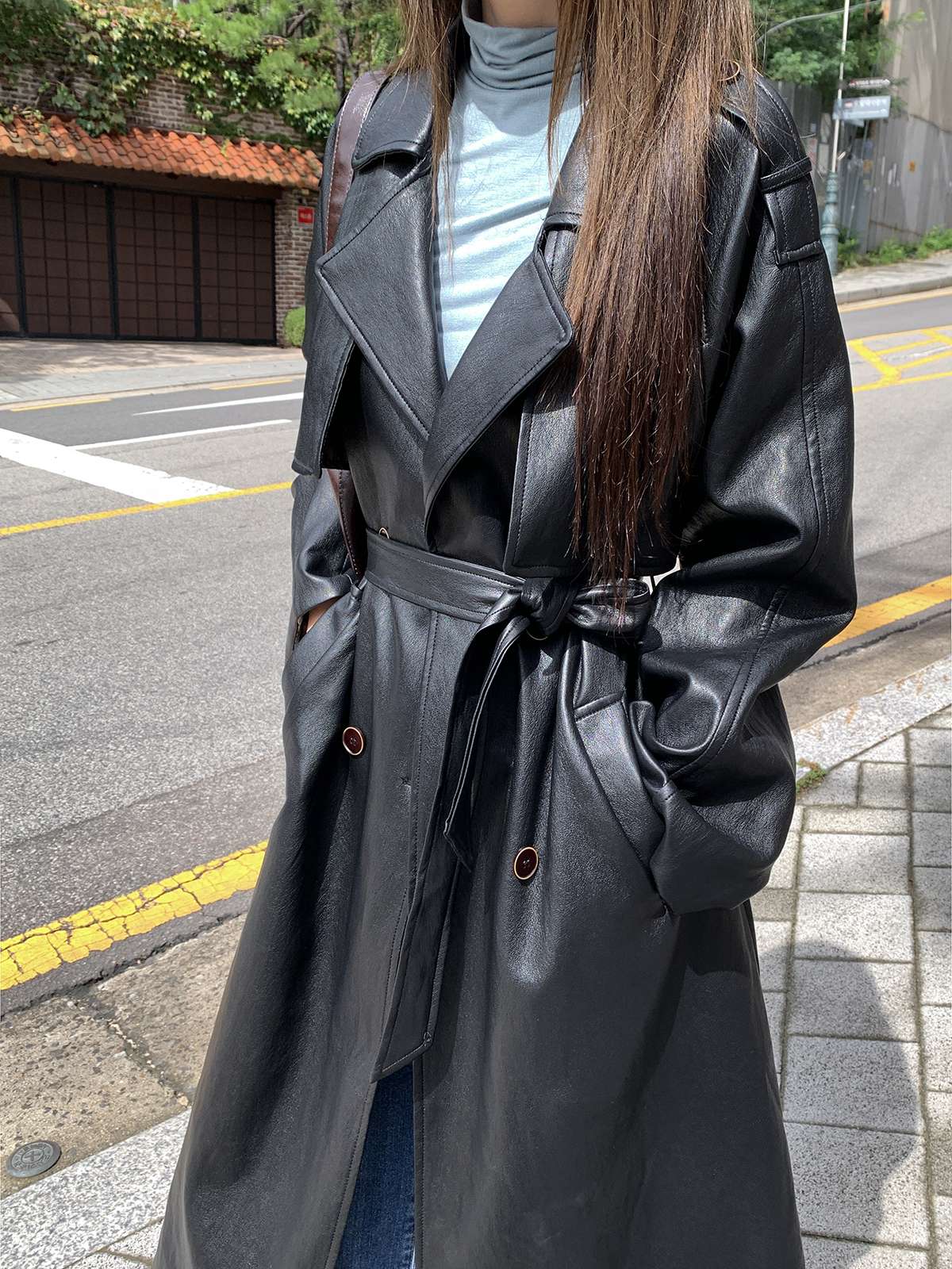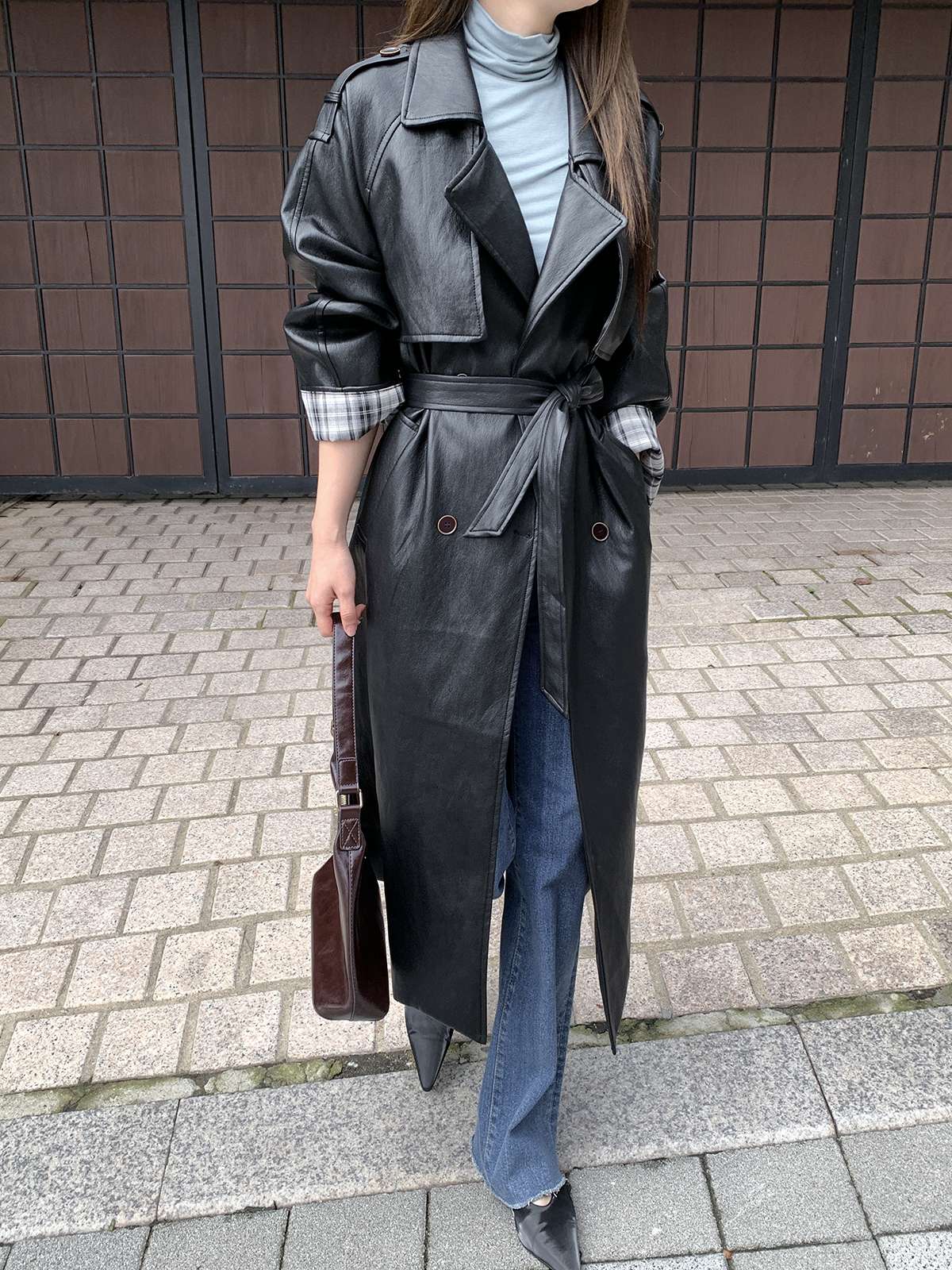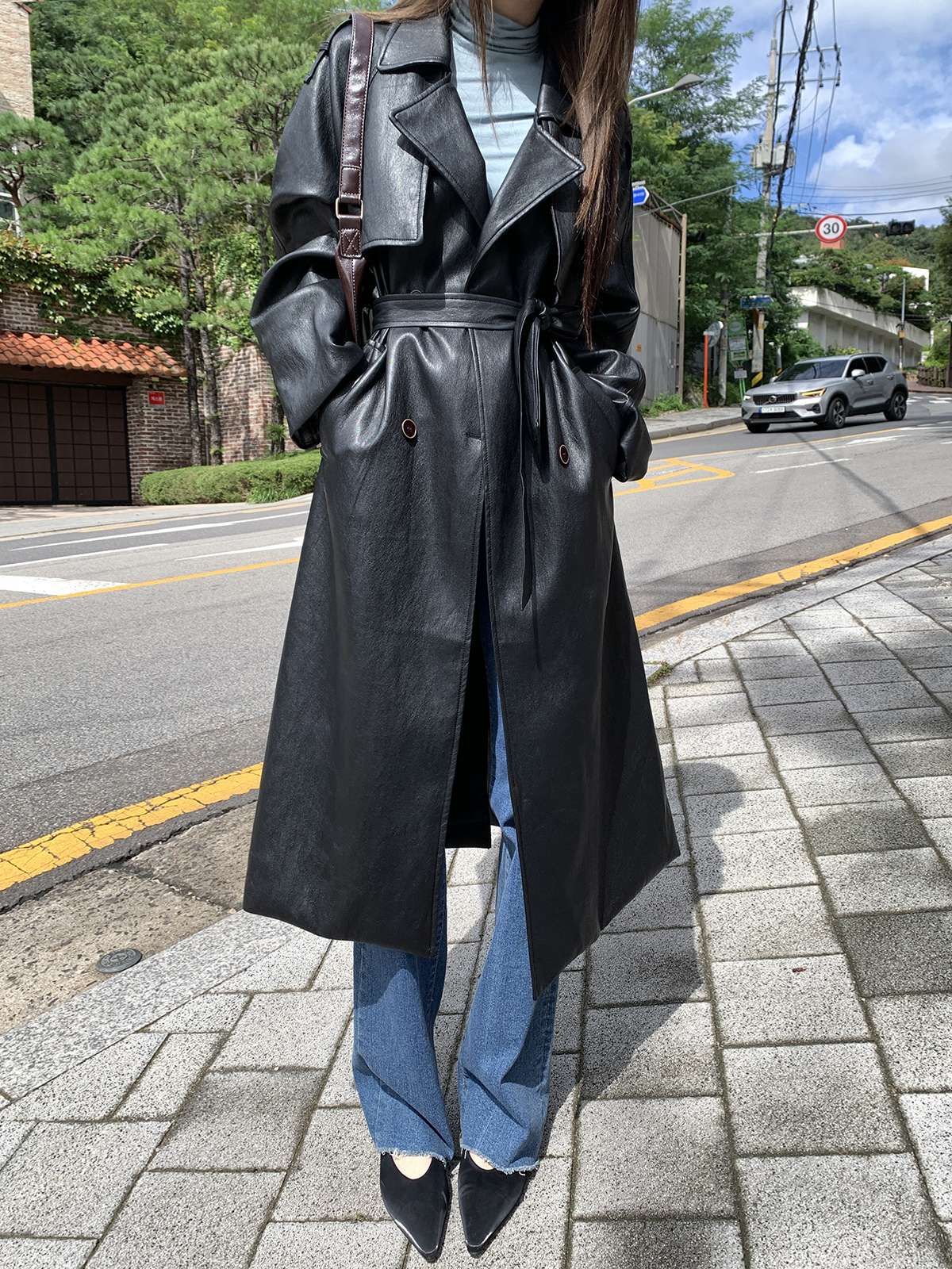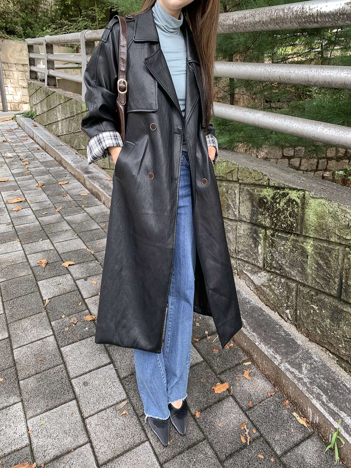 넉넉한 핏감에 가죽 소재가 돋보이는 트렌치 코트