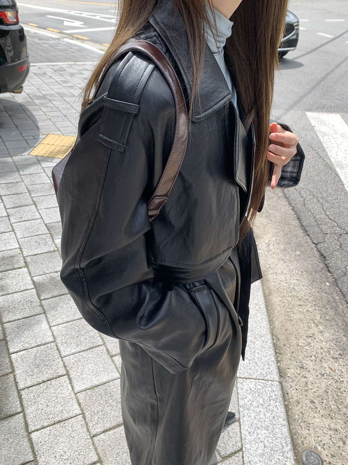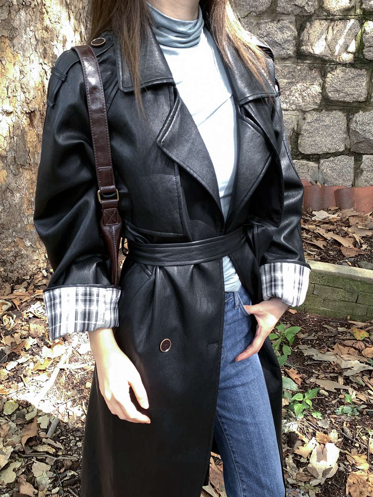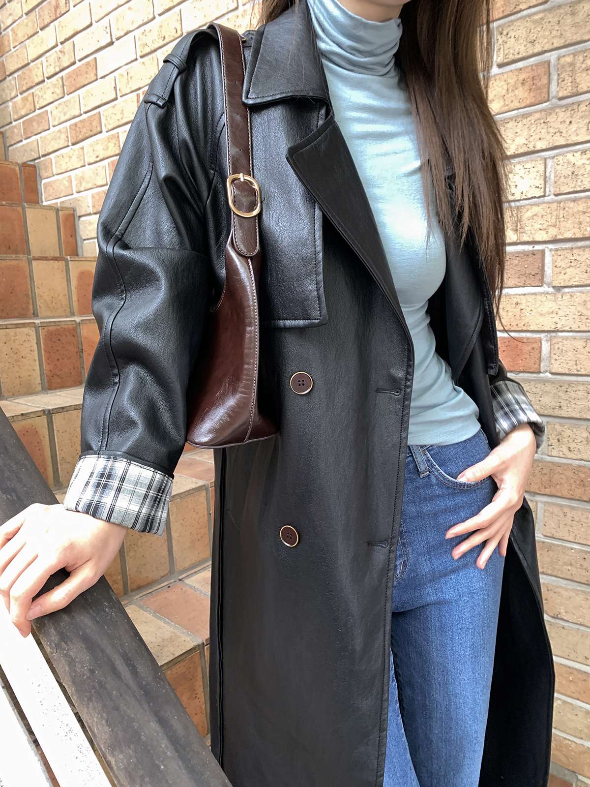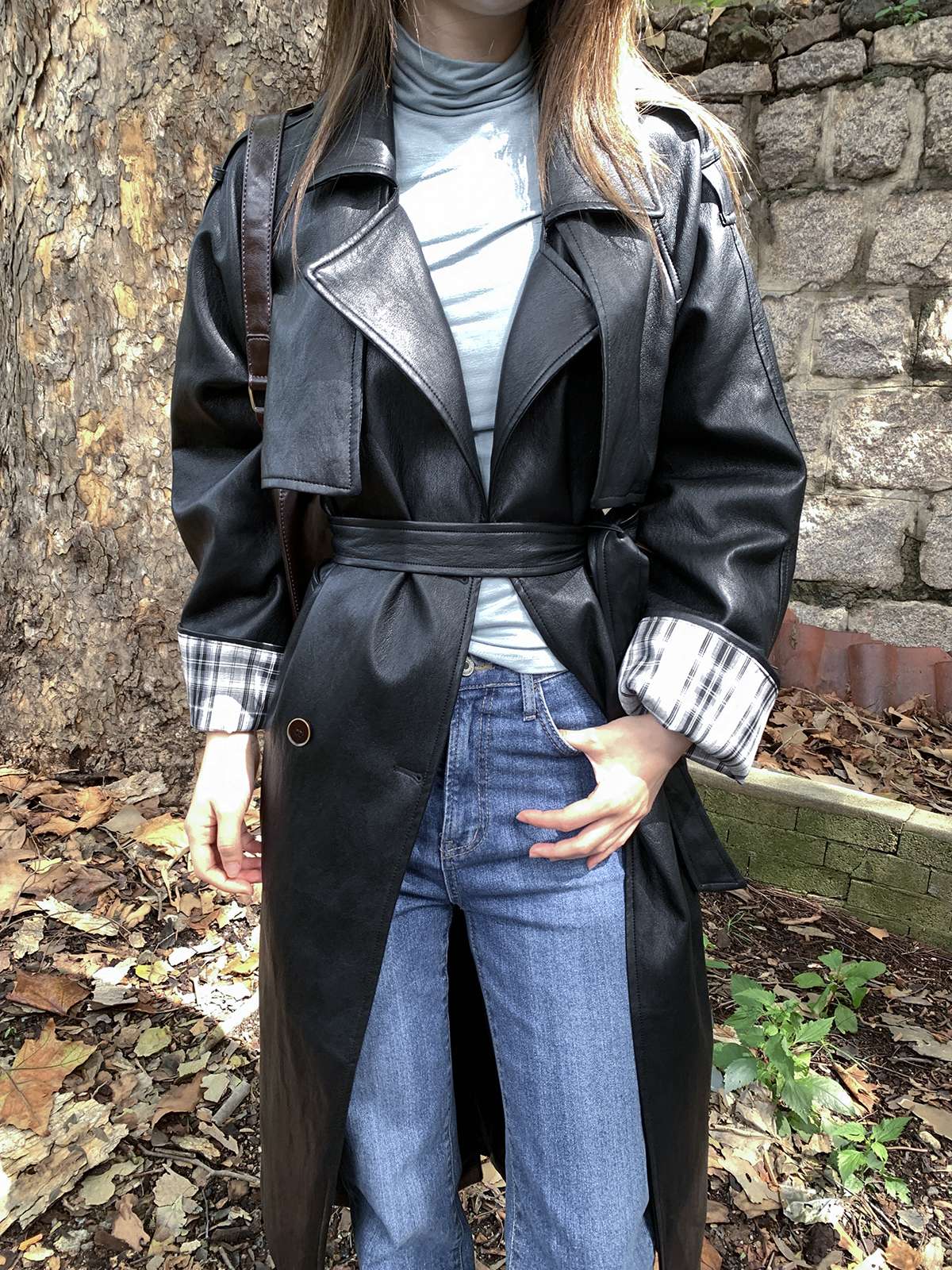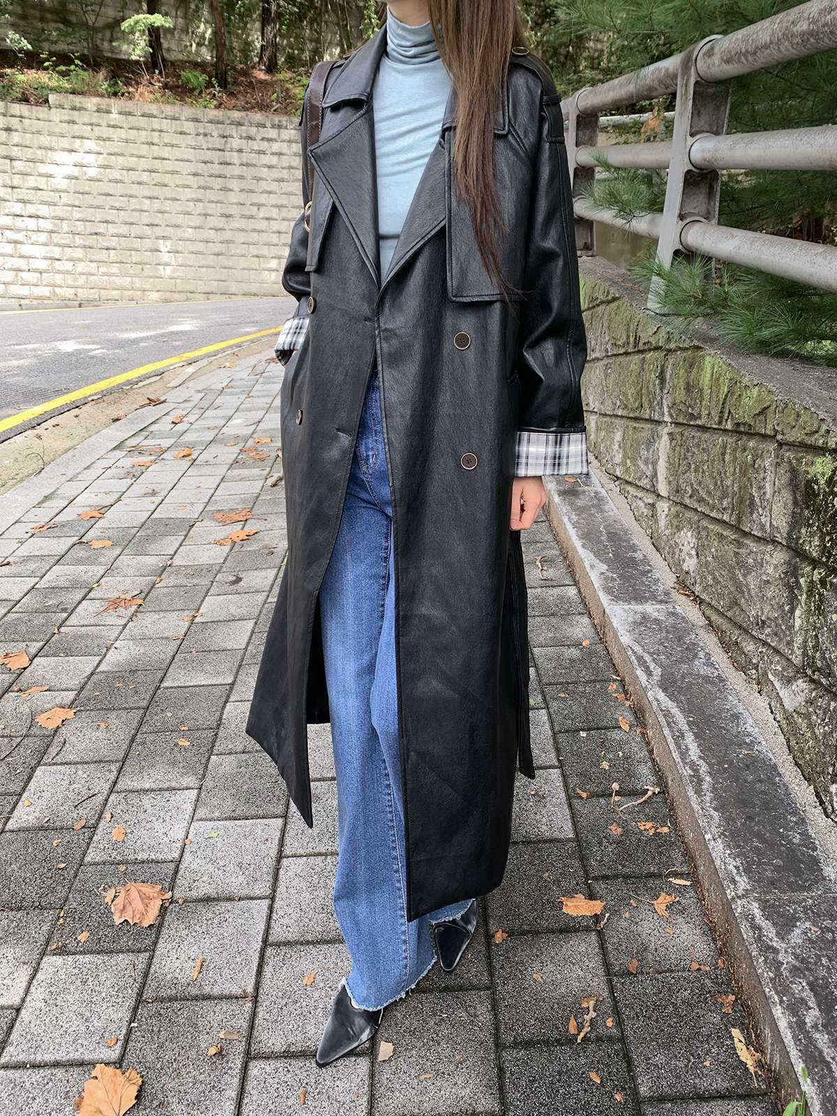 넉넉한 핏감에 가죽 소재가 돋보이는 트렌치 코트