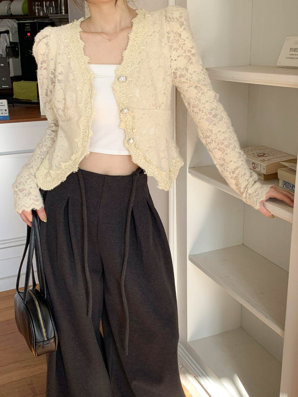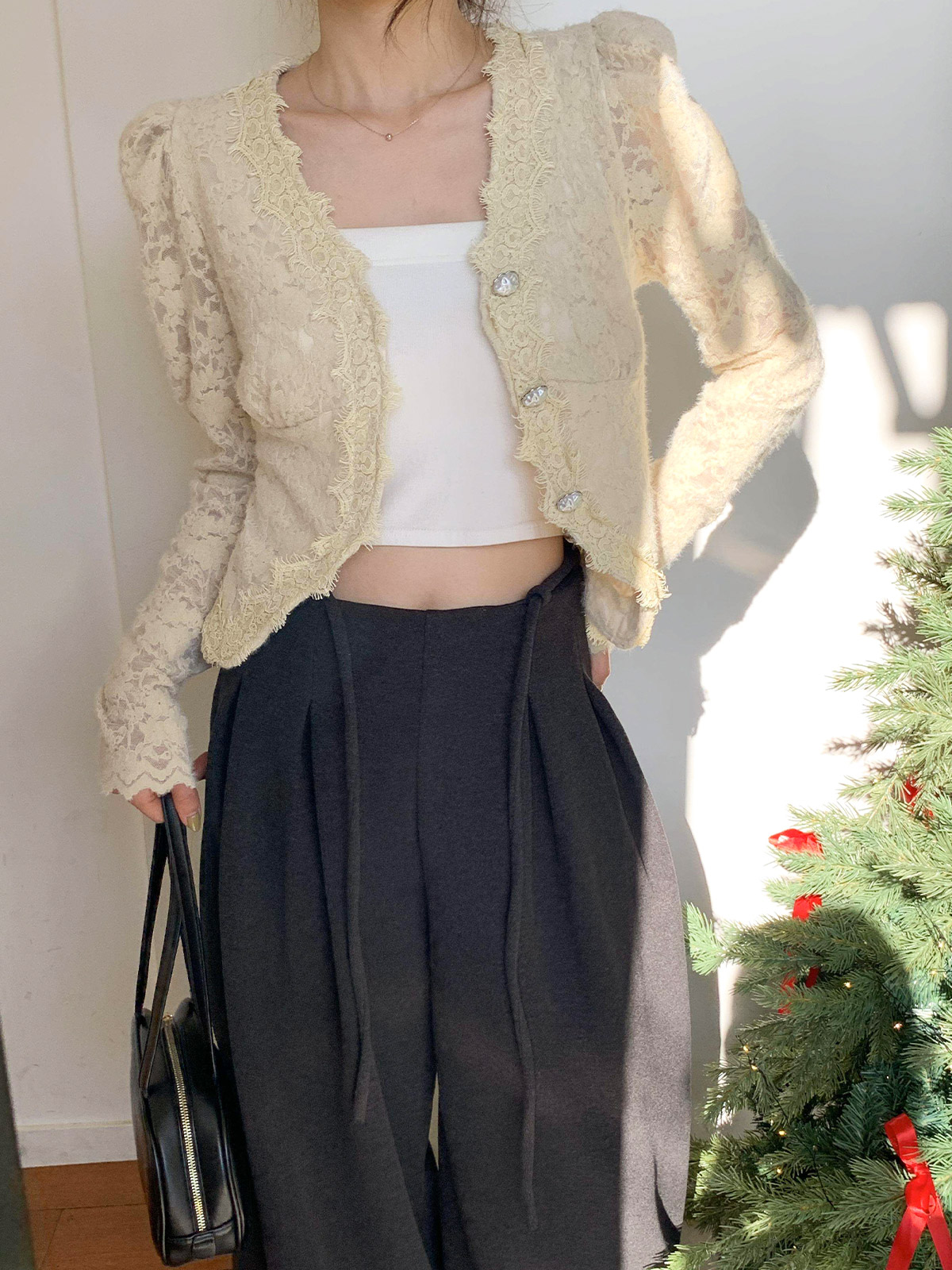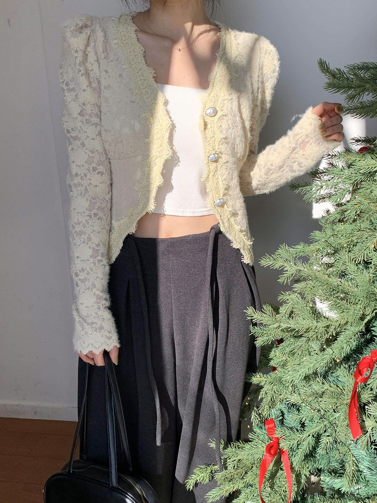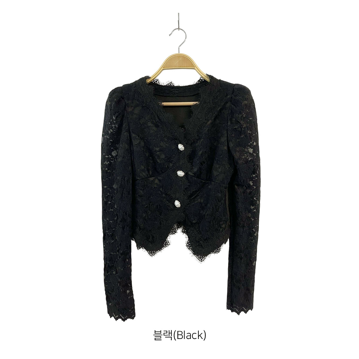 진주 단추 디테일로 고급스러운 무드를 주며,