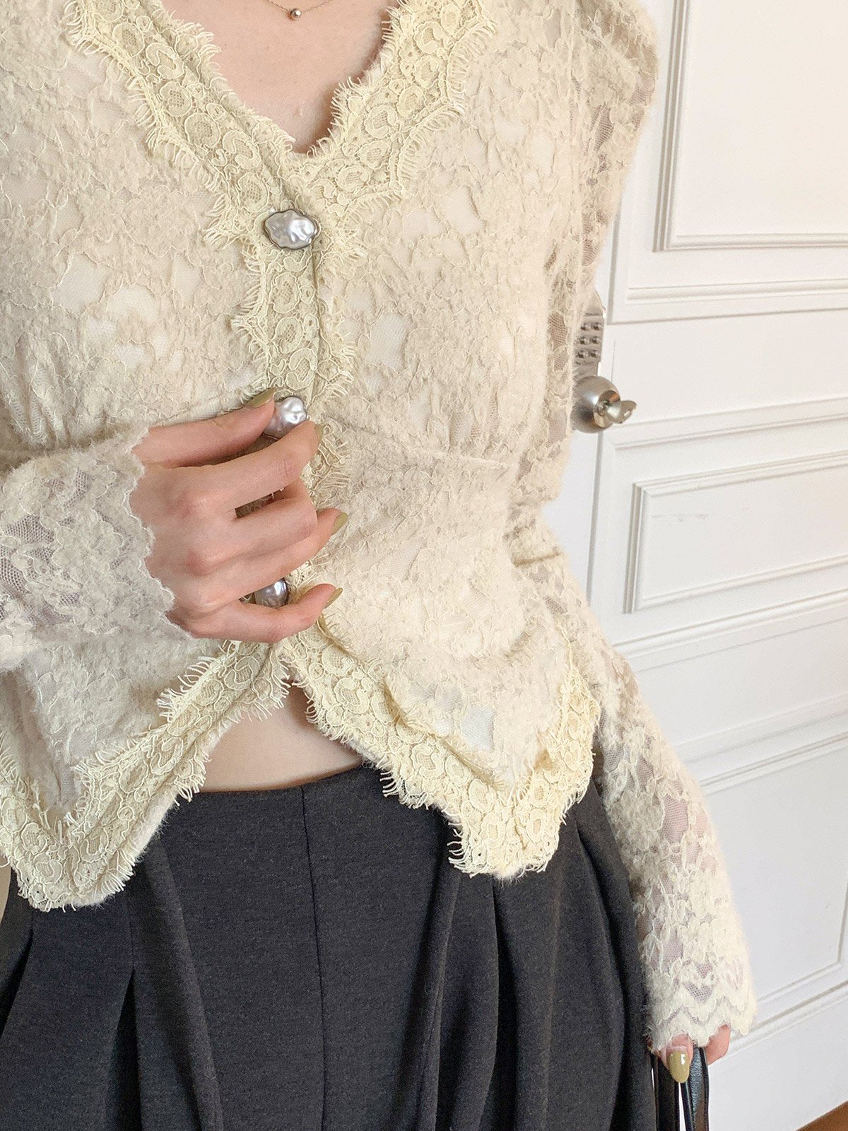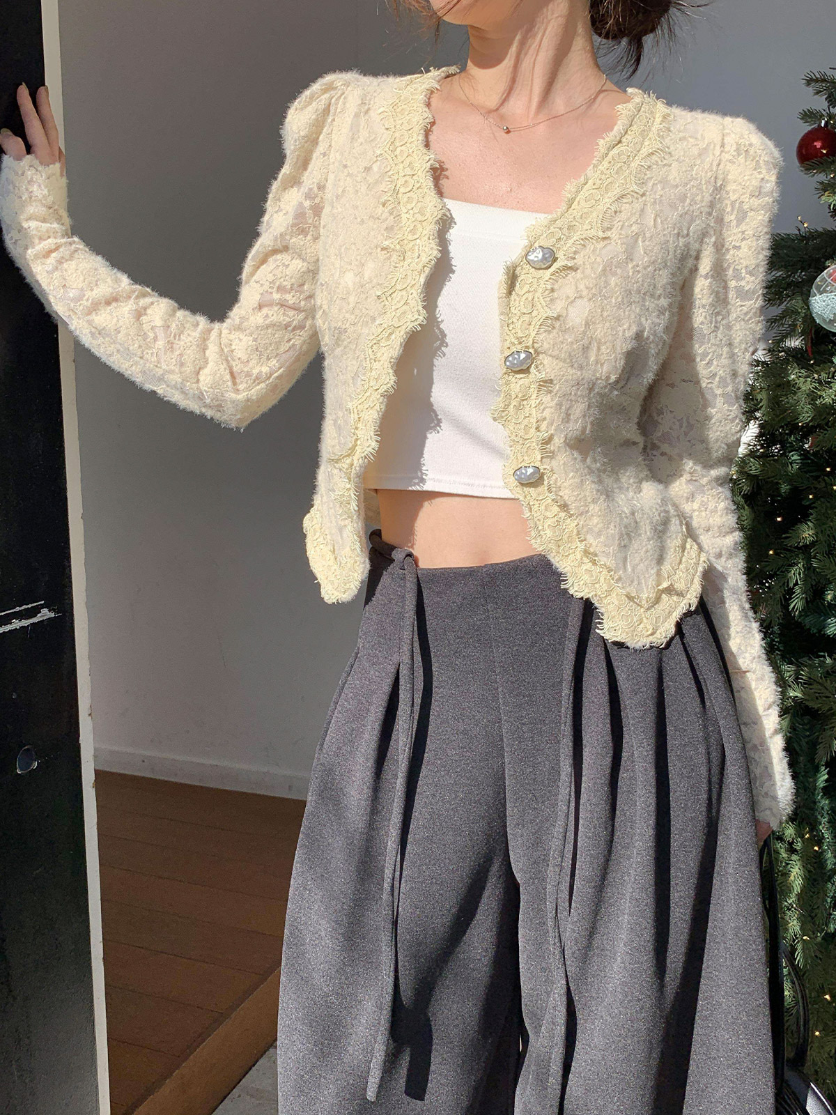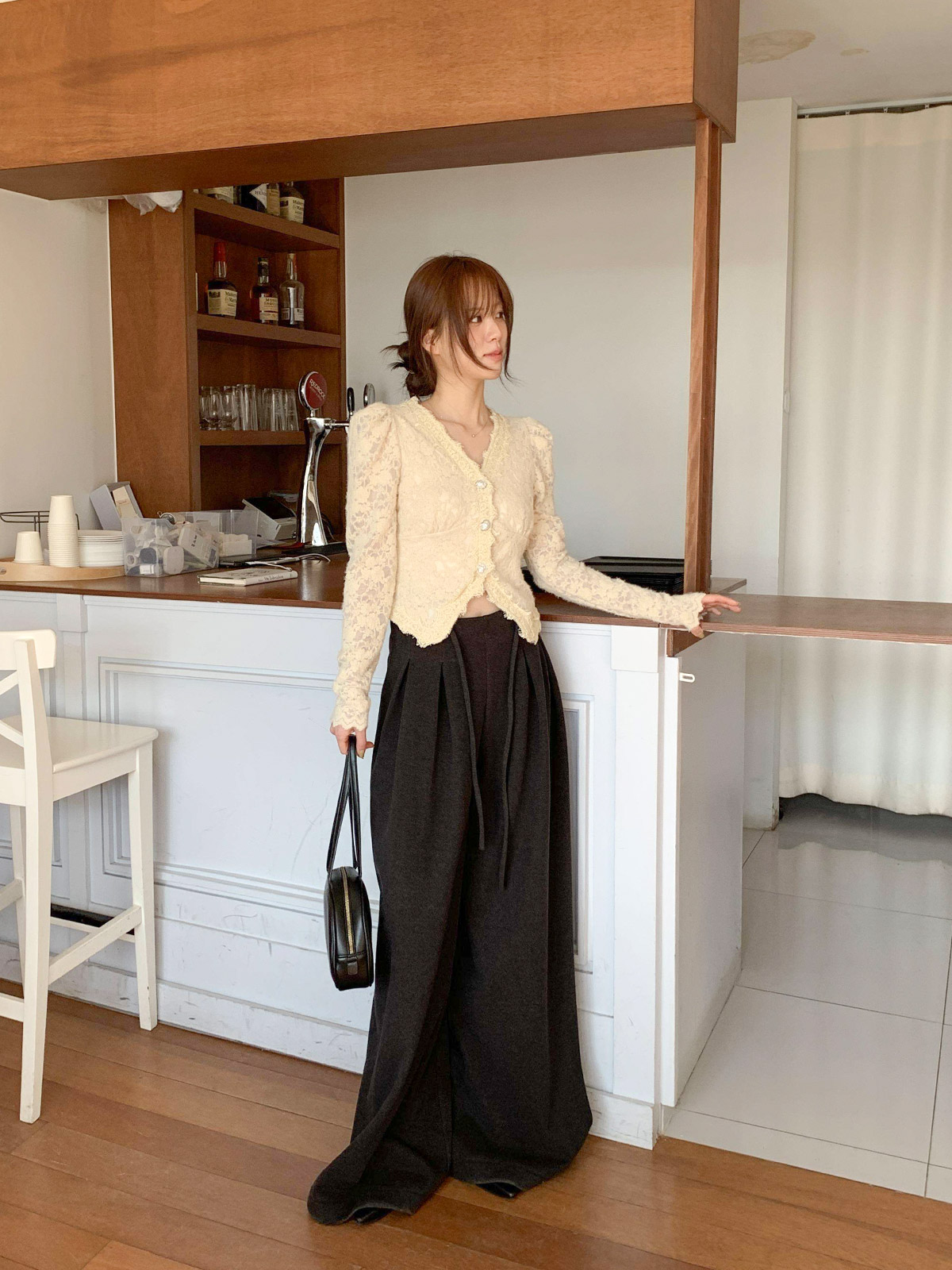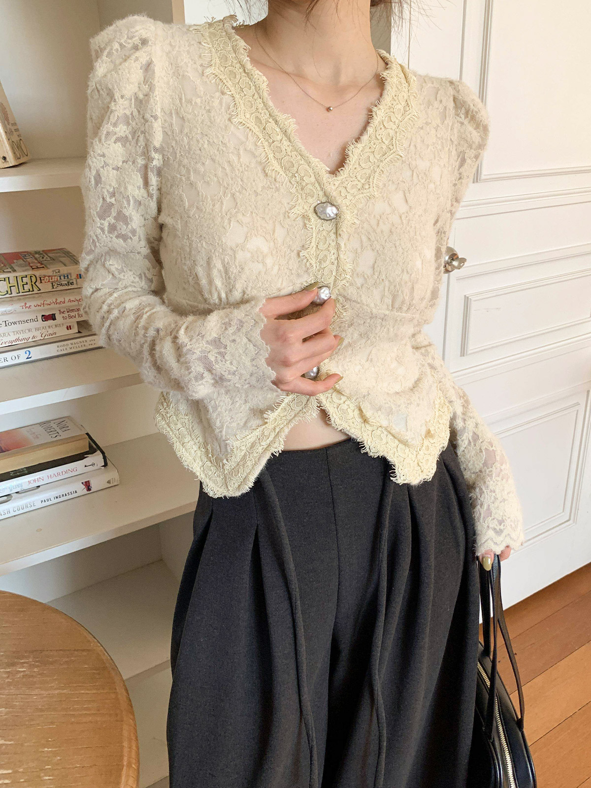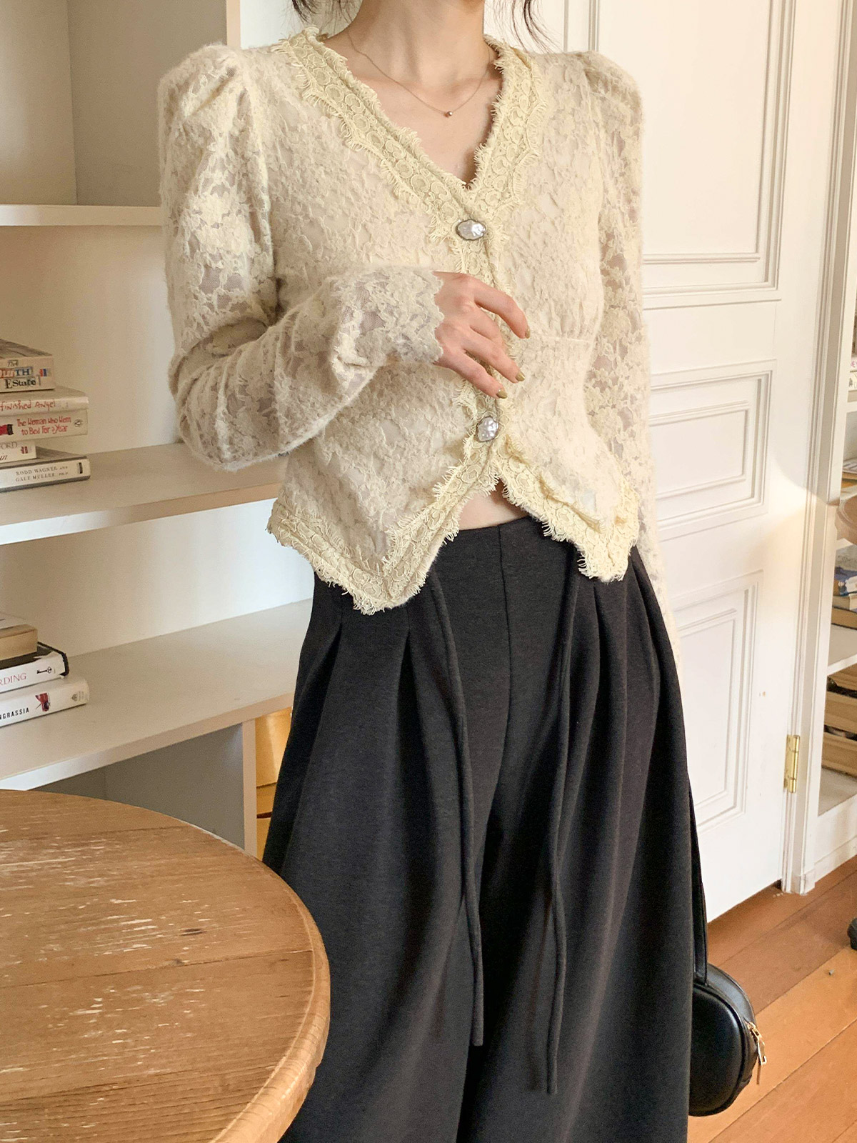 진주 단추 디테일로 고급스러운 무드를 주며,