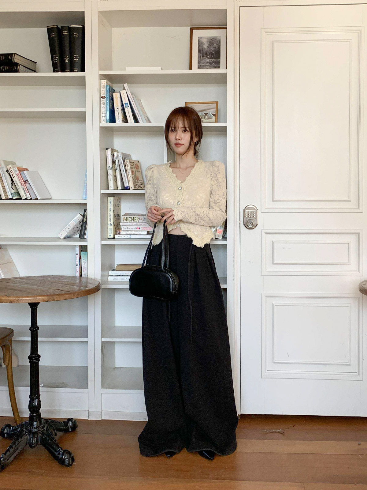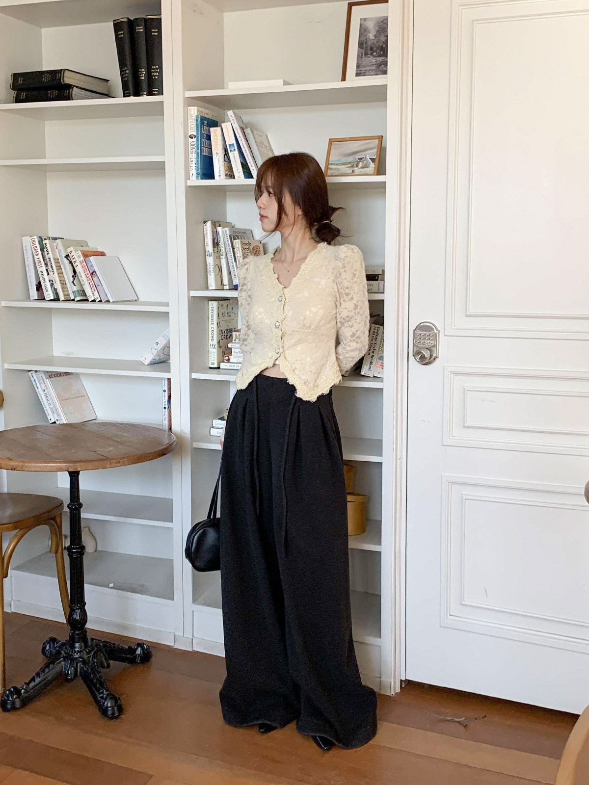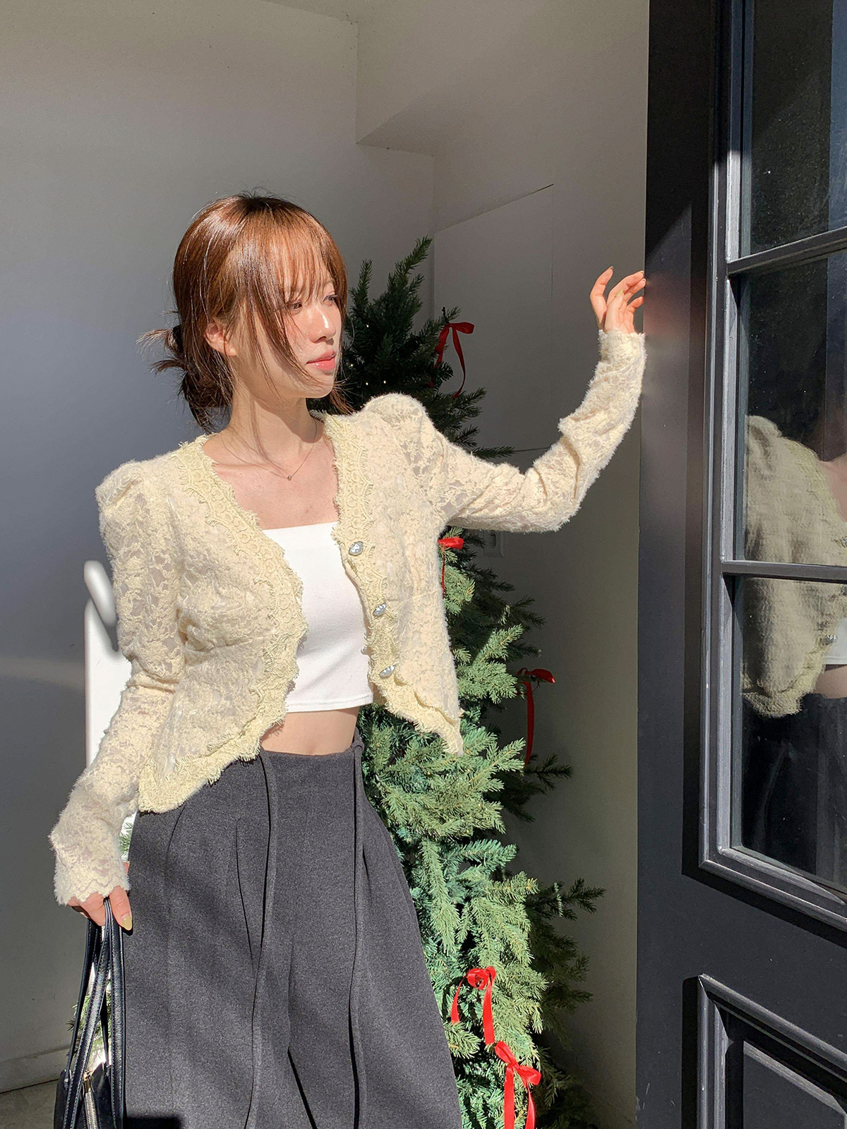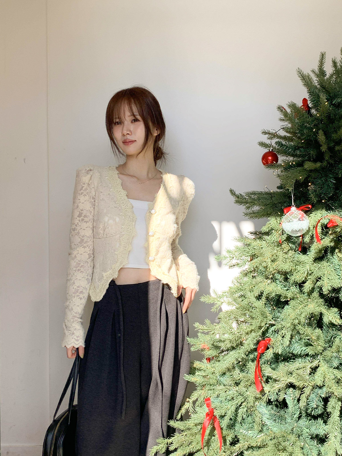 진주 단추 디테일로 고급스러운 무드를 주며,